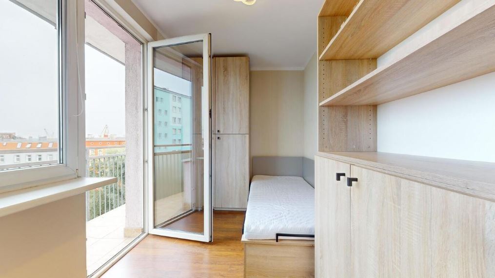 - sypialnia z meblami na wymiar i łóżkiem jednoosobowym z wyjściem na przestronny balkon.