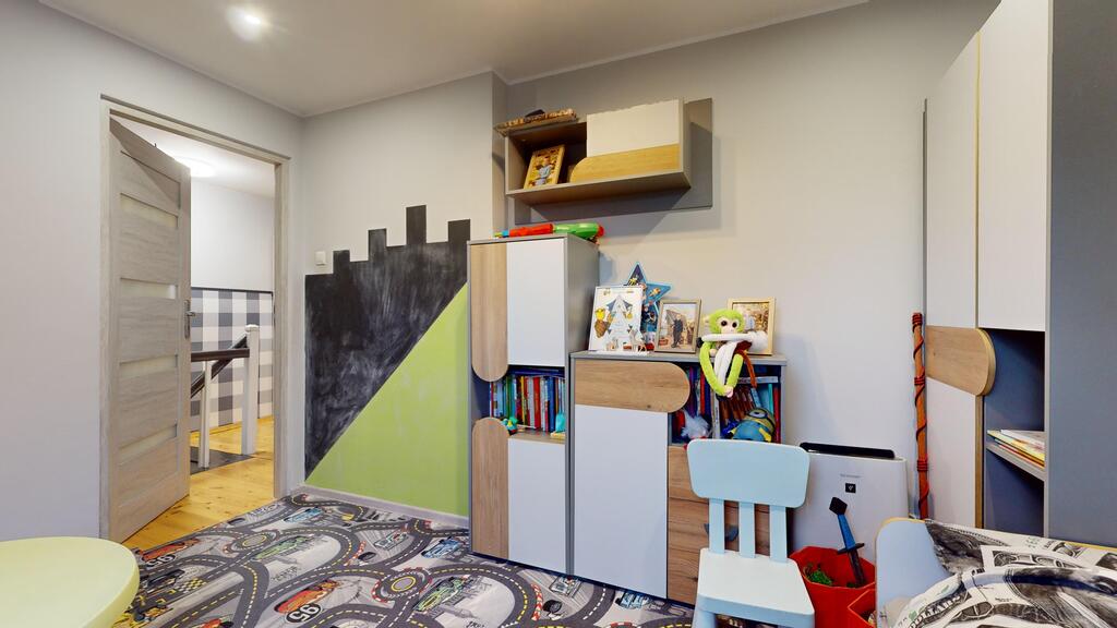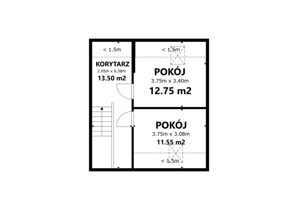 • Piętro: dwa ustawne pokoje oraz korytarz.