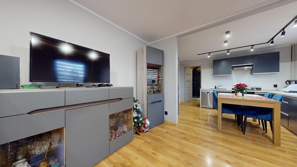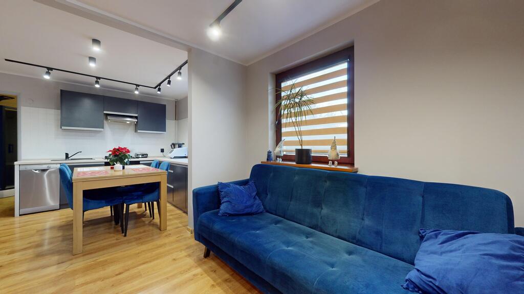 Mieszkanie o powierzchni 72,95 m² (dwupoziomowe) znajduje się w cichej, malowniczej okolicy w sąsiedztwie domków jednorodzinnych.