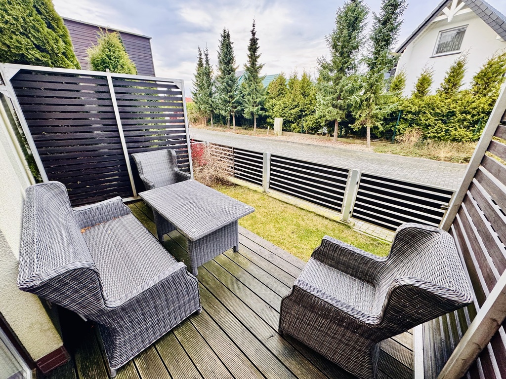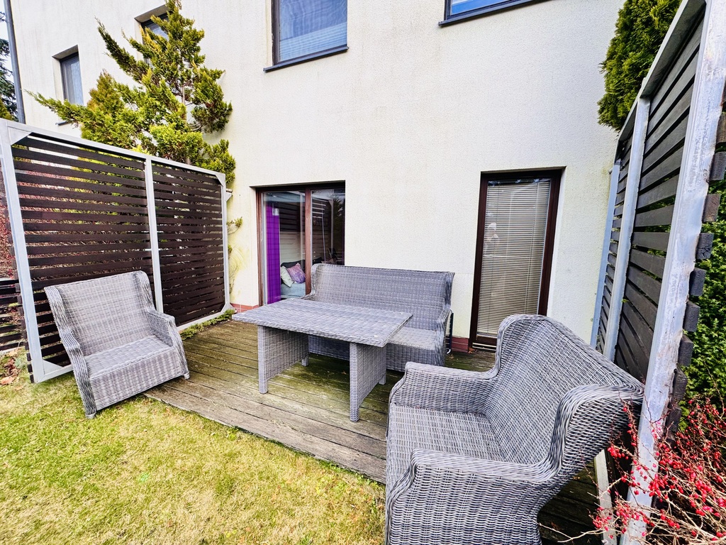 Przy nieruchomości do indywidualnego korzystania przez właściciela ogródek częściowo utwardzony (deska tarasowa) oraz teren zielony z tarasem od strony wejścia do nieruchomości.