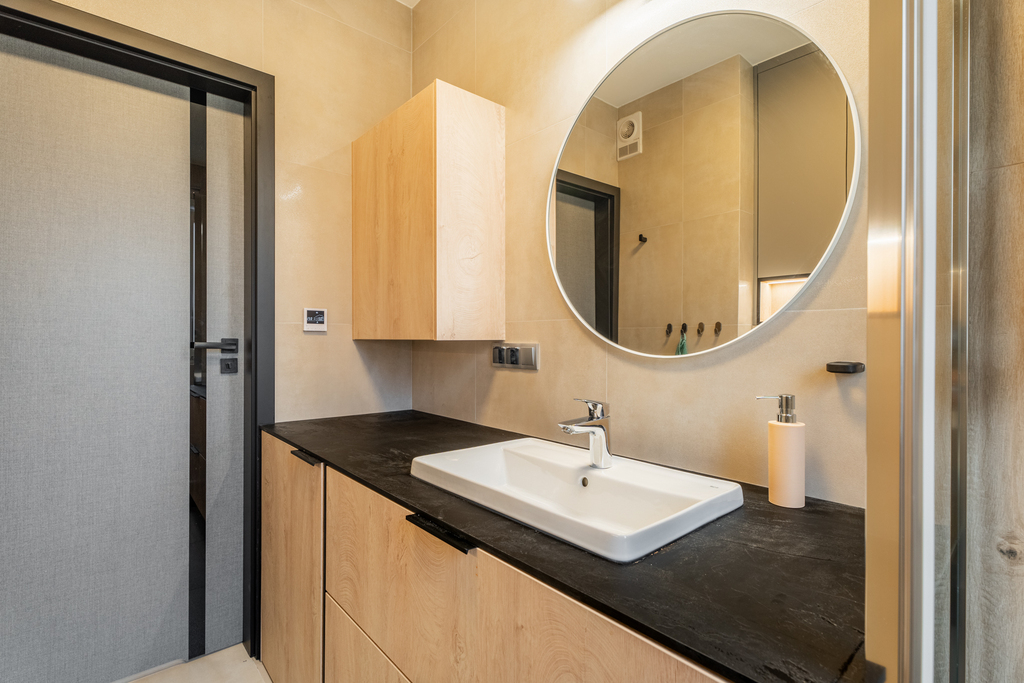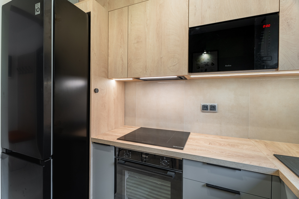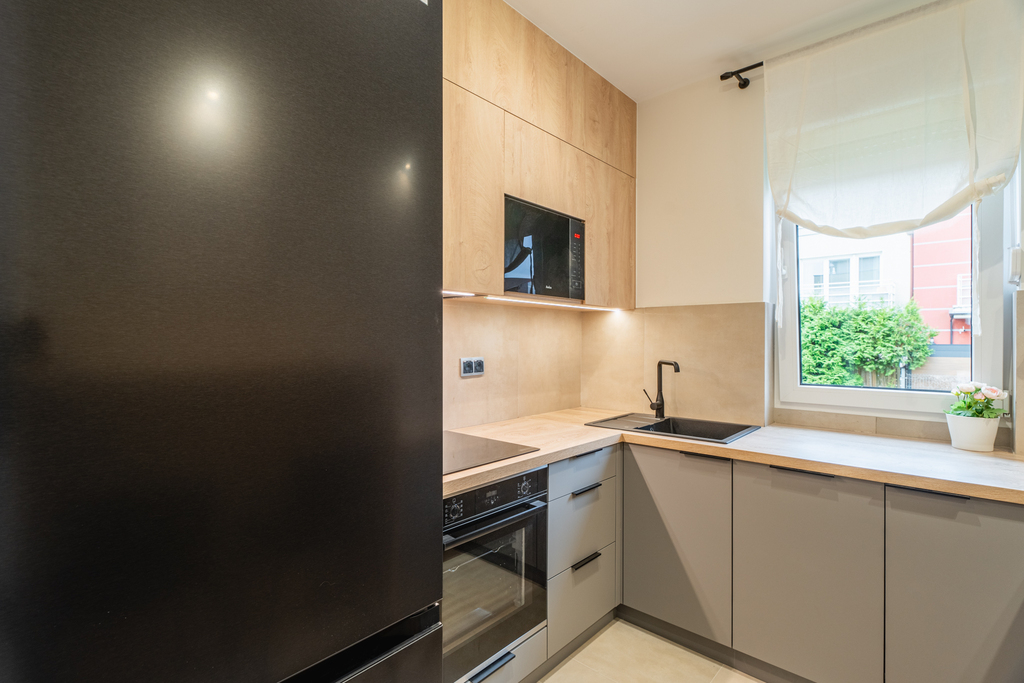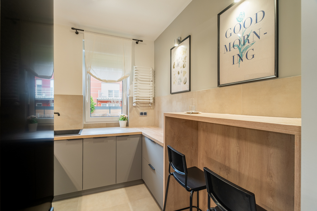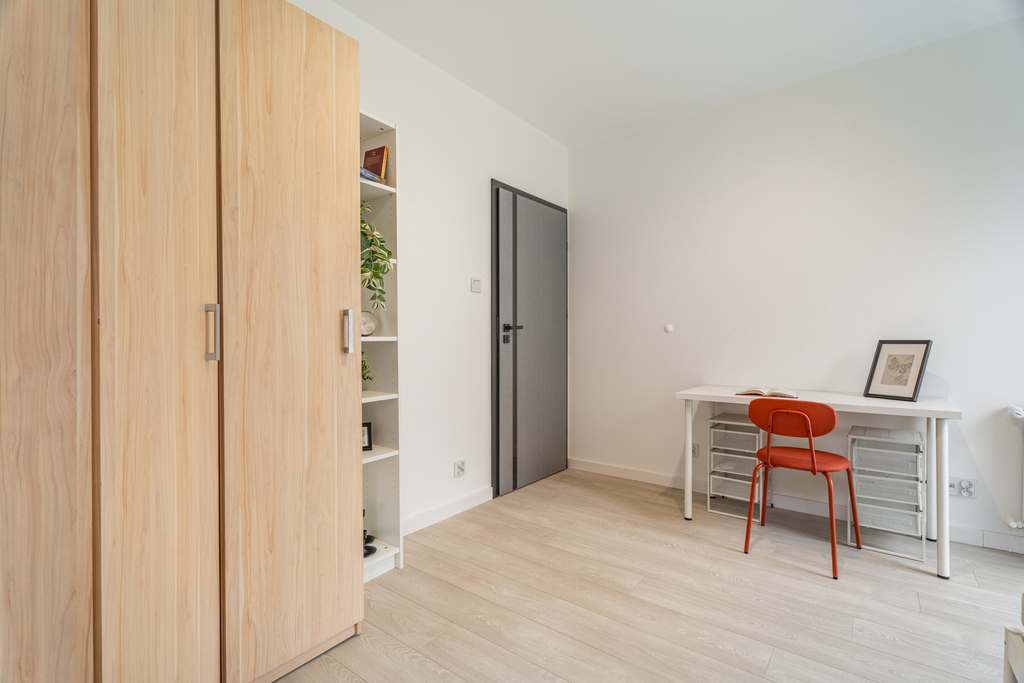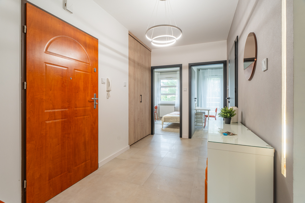 Salon wyposażony jest w kanapę rozkładaną, stolik, komodę oraz stół z krzesłami. W dwóch pokojach mamy do dyspozycji łóżko, biurko, szafę oraz regał. Kuchnia wyposażona we niezbędne sprzęty: kuchenka, piekarnik, okap, lodówko-zamrażarka, zmywarka, zlewozmywak, meble w zabudowie z dużą ilością miejsca do przechowywania rzeczy. W łazience: kabina prysznicowa, pralka, umywalka z szafką, lustro z podświetleniem oraz toaleta. W przedpokoju znajduje się garderoba w zabudowie, toaletka z dwiema pufami, lustro oraz wieszak.