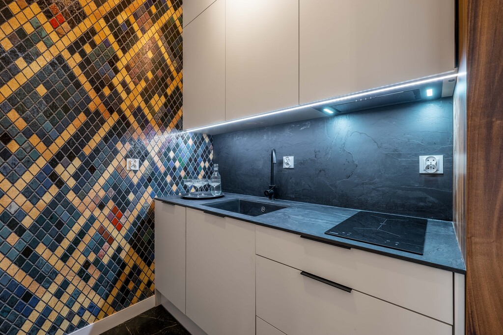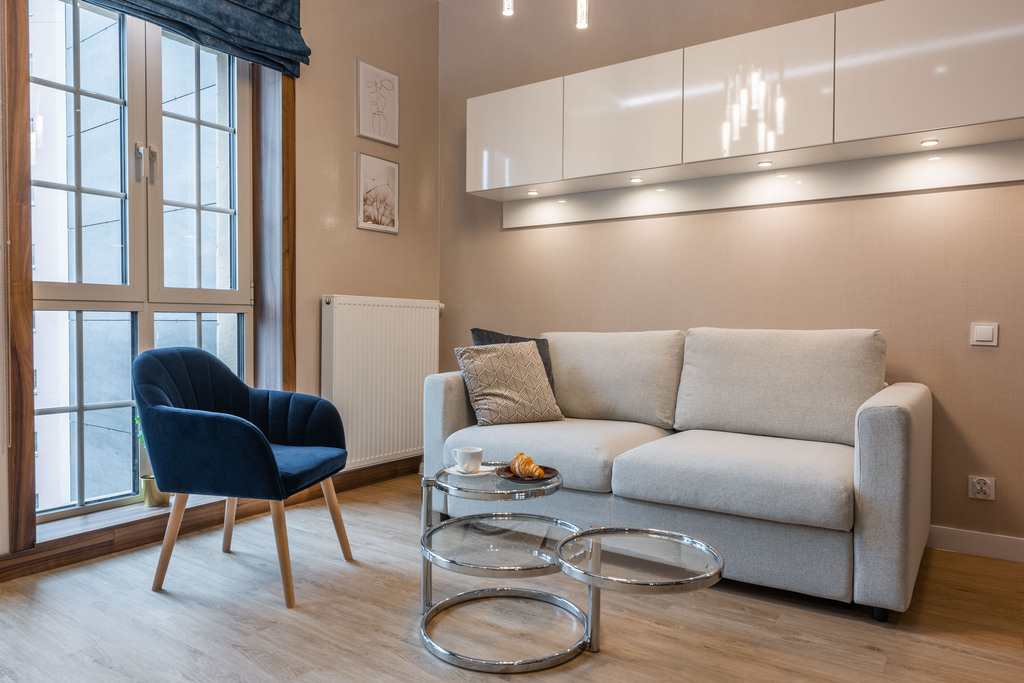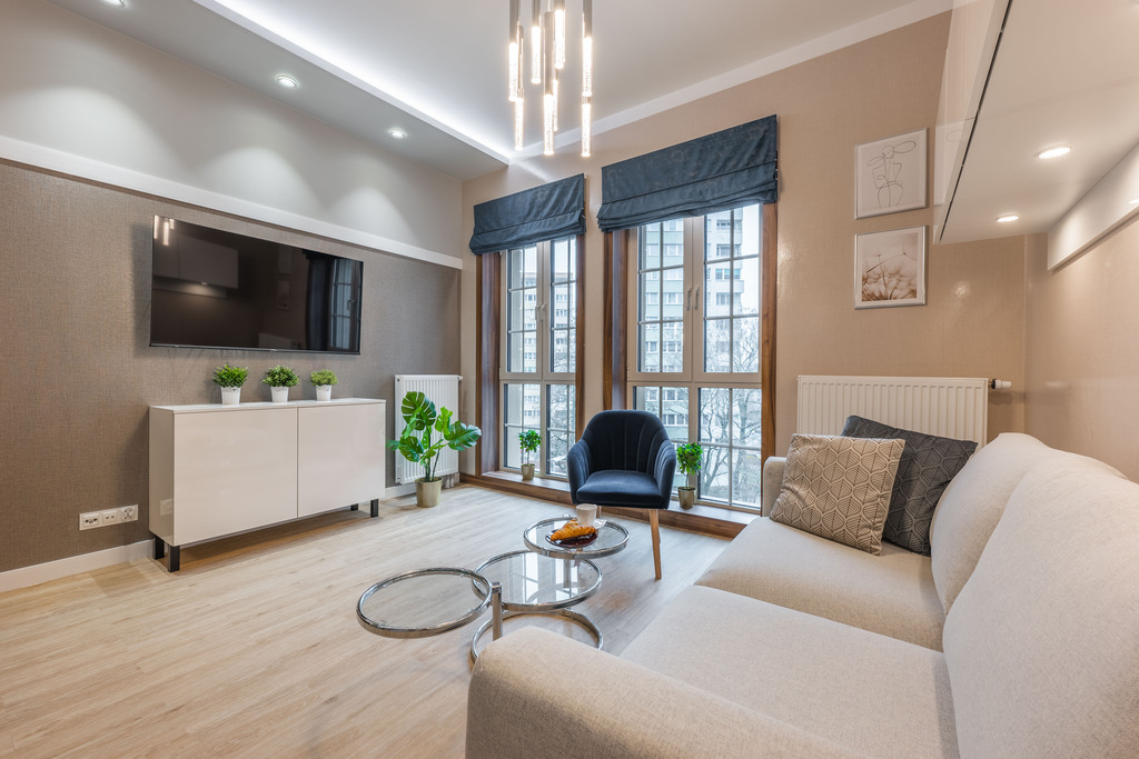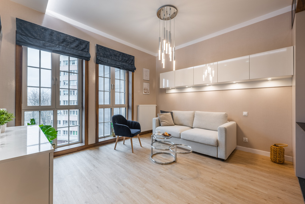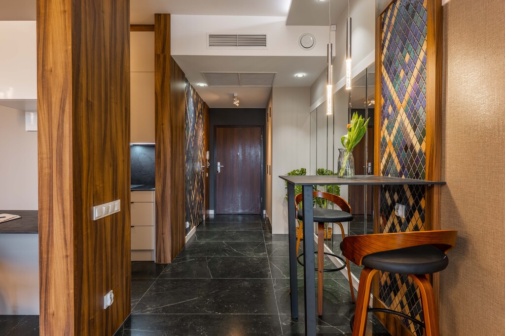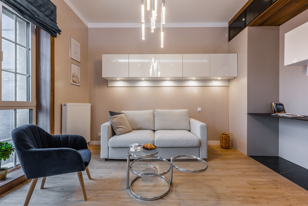 Mieszkanie jest w pełni umeblowane, wyposażone w sprzęty RTV i AGD oraz wykończone jest w wysokim standardzie, z najwyższej jakości materiałów oraz z wielką dbałością.