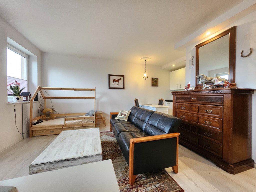 Salon z częścią w której można wydzielić część sypialnianą. Mieści się tam pojemna szafa w zabudowie.
