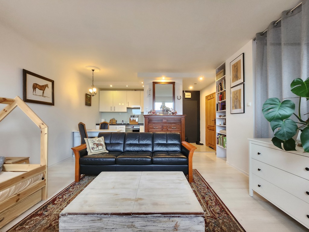 Salon z częścią w której można wydzielić część sypialnianą. Mieści się tam pojemna szafa w zabudowie.