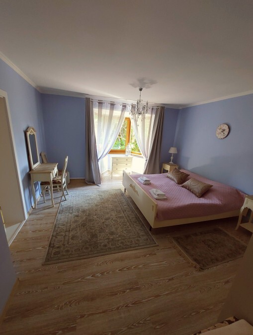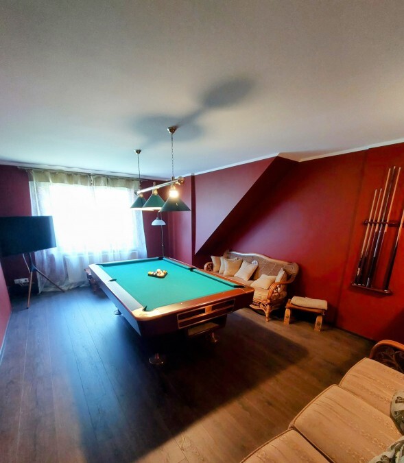 Duży dom ma powierzchnię 180m2, w którym znajduje się duża kuchnia z salonem 5 pokoi z łazienkami oraz pokój rozrywki ze stołem bilardowym.
