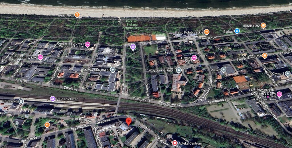 Centrum Kołobrzegu, tuż obok stacji kolejowej, co zapewnia doskonałe połączenia z innymi miastami, m. in. Szczecinem, Gdańskiem, Poznaniem, Warszawą. Co więcej, tuż obok budynku znajduje się wejście na kładkę nad torami umożliwiające wygodne przejście na plażę, znajdującą się zaledwie 500m dalej. Do molo w Kołobrzegu odległość wynosi zaledwie 1,5 km. W najbliższej okolicy znajdziemy aptekę, sklep Żabka, Biedronkę, oddział banku oraz liczne punkty gastronomiczne i usługowe. Tuż obok budynku mamy też monitorowany strzeżony parking (za opłatą), ale w okolicy dostępne są też miejsca postojowe na ulicy. W odległości 90 km znajduje się najbliższy port lotniczy w podszczecińskim Goleniowie.