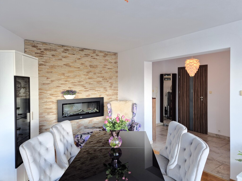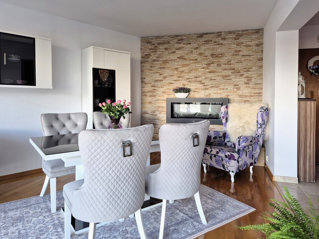 * salon z nowoczesnym elektrycznym kominkiem w zabudowie, stołem jadalnianym oraz tapicerowanymi krzesłami, elegancką sofą typu Chesterfield i wygodnym fotelem. Warto zwrócić uwagę na duże okna zapewniające naturalne światło.