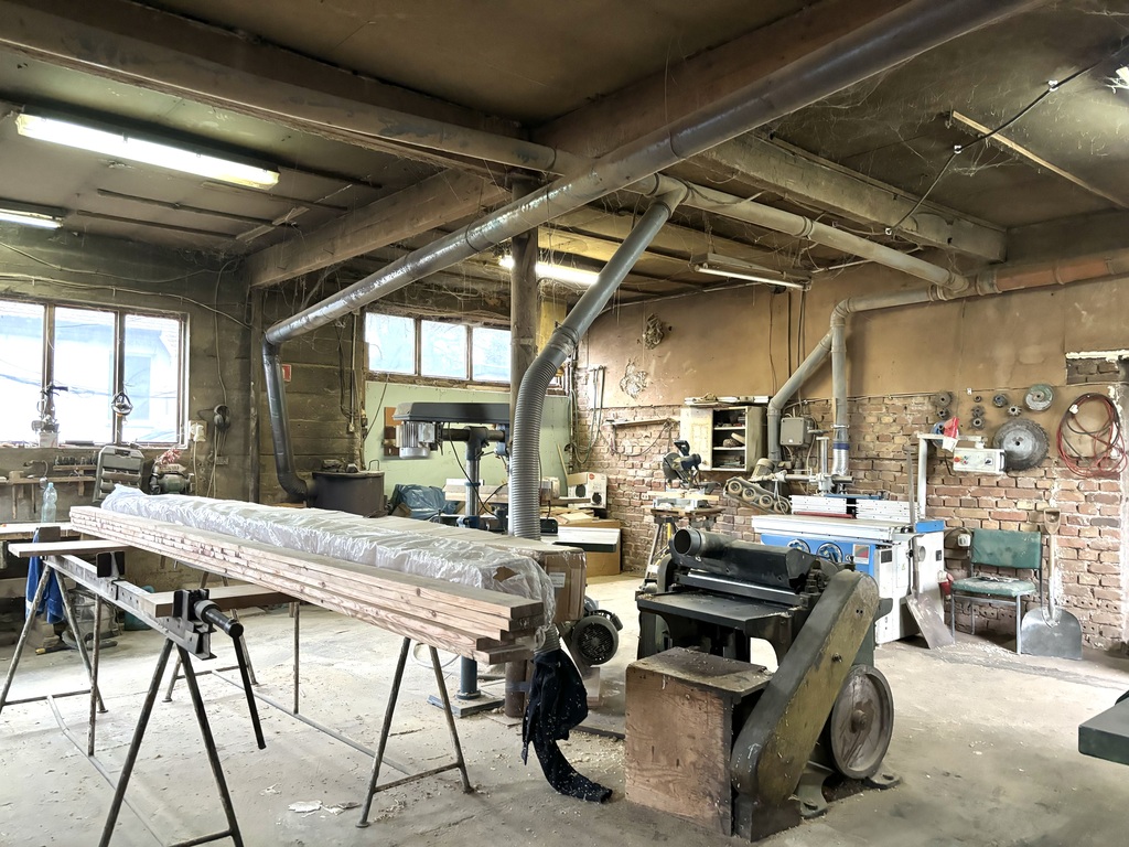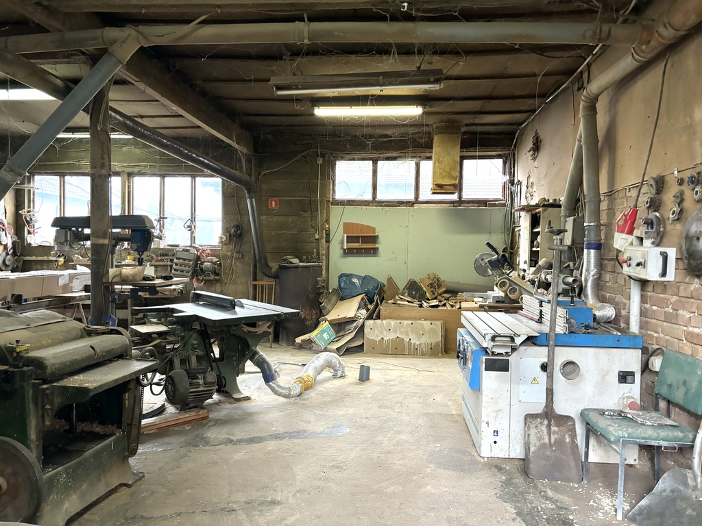 Obecnie na działce usytuowany jest budynek dwupoziomowy rzemieślniczy z usługami stolarskimi, składający się z kilku pomieszczeń, maszyny na wyposażeniu w cenie nieruchomości.