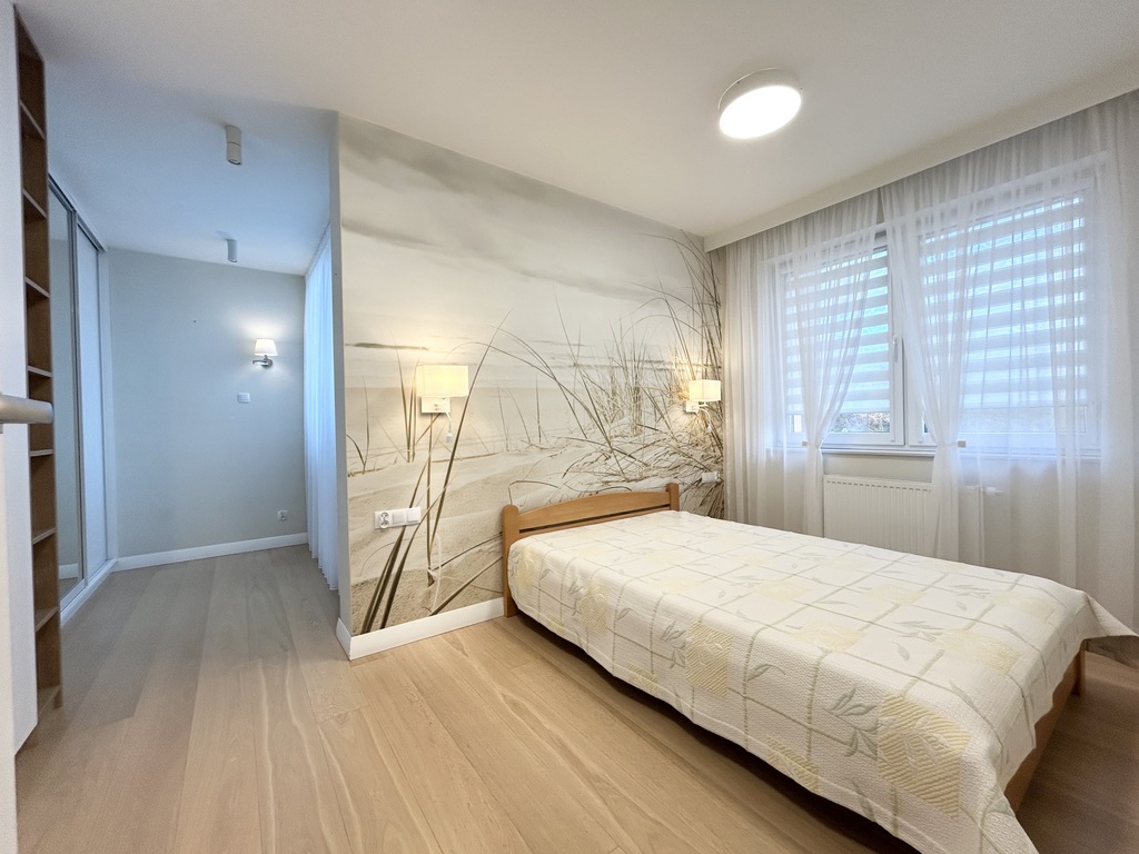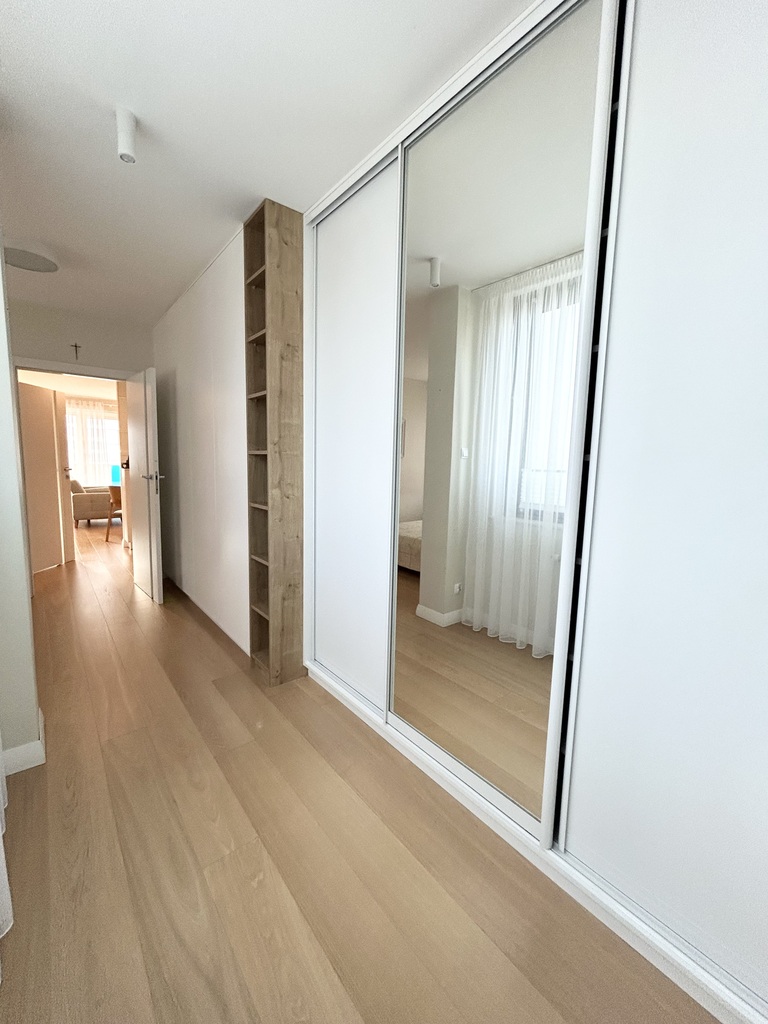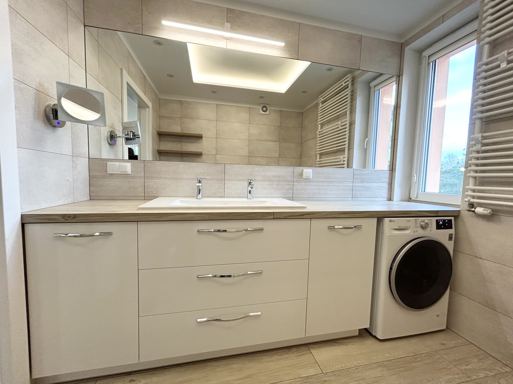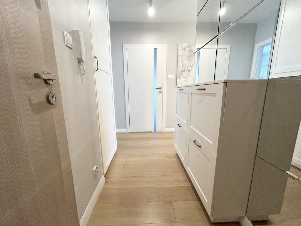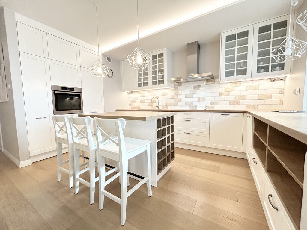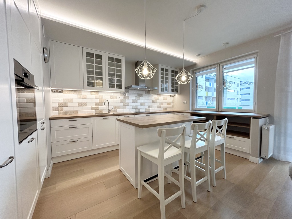 W kuchni, łazience, oraz sypialni zostały wykonane zabudowy meblowe z wysokiej klasy materiałów.