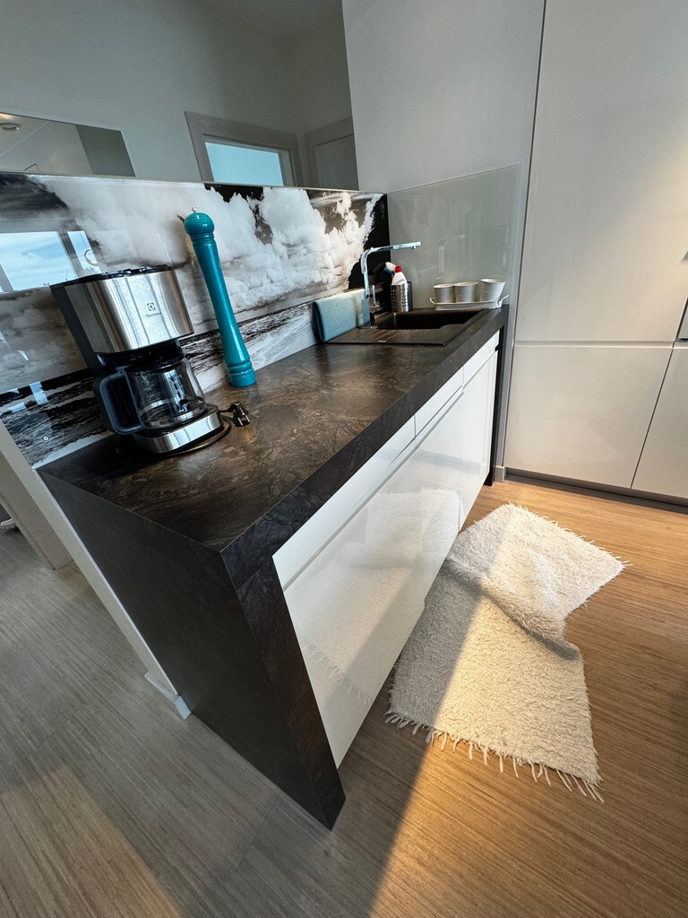W pełni wyposażona kuchnia z piekarnikiem, zmywarką, pralką, lodówką z zamrażarką oraz płytą indukcyjną.