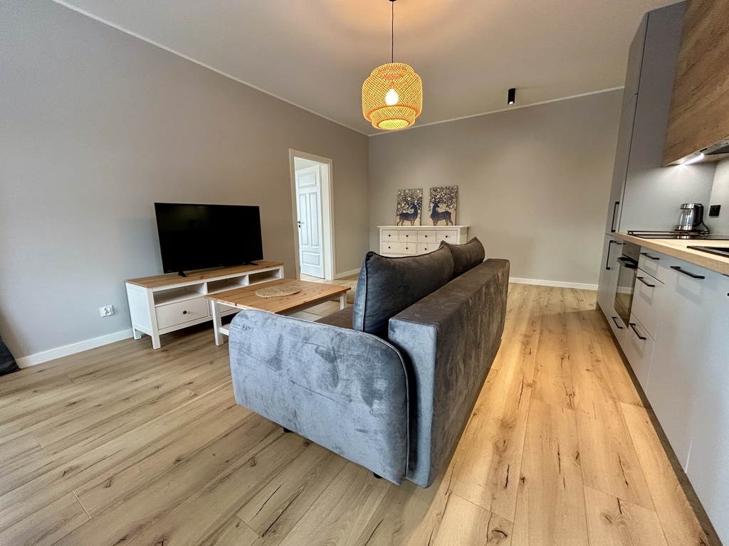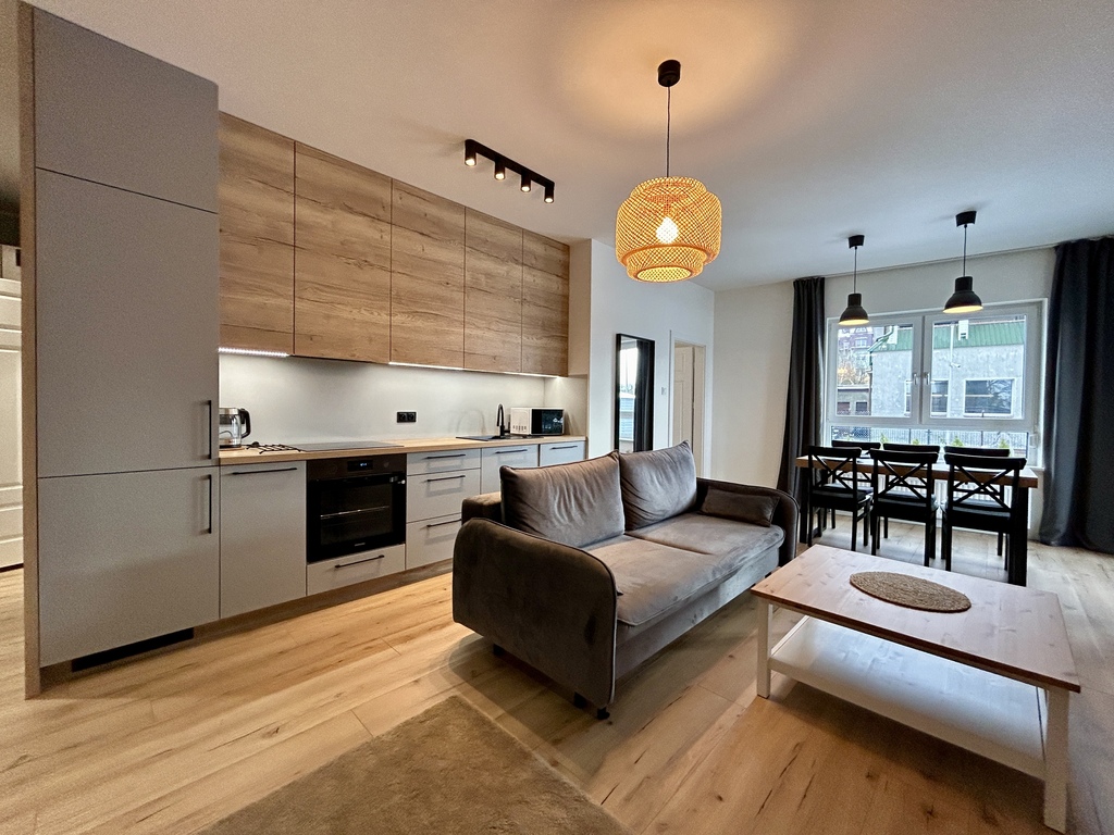 Mieszkanie jest w pełni umeblowane i wyposażone w niezbędne sprzęty.