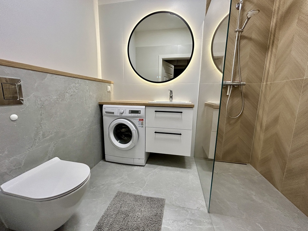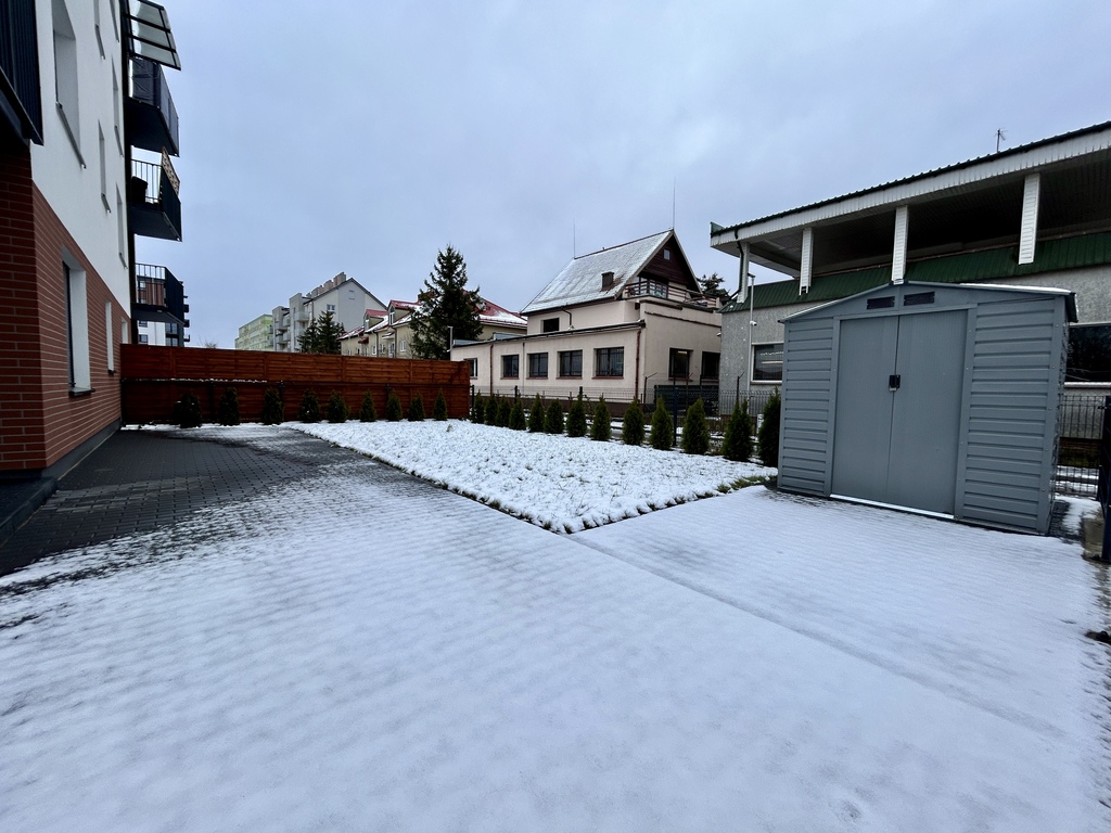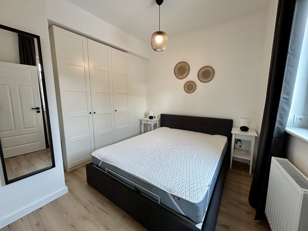 Mieszkanie znajduje się na parterze nowoczesnego budynku z 2023 roku, na terenie zamkniętym, z windą oraz monitoringiem. Ma w pełni wyposażony salon z aneksem kuchennym oraz wyjściem na ogród, osobno dwie sypialnie- jedna może służyć jako gabinet do pracy, łazienkę oraz przestronny korytarz.