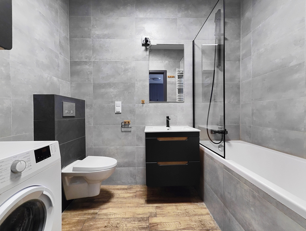 - łazienka wyposażona w wannę z funkcją prysznica, wc, umywalkę, pralkę oraz grzejnik drabinkowy,