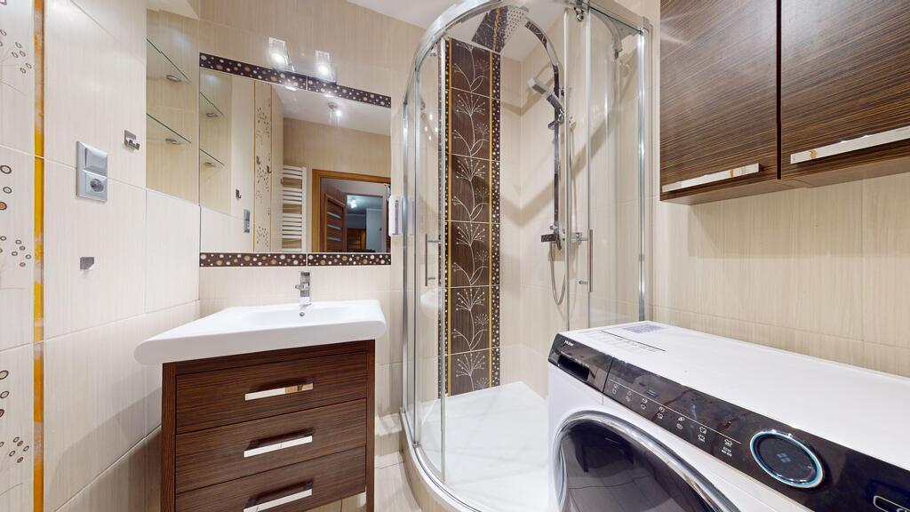 - łazienka z kabiną prysznicową, wykończona w stylowych płytkach (z ok. 2-letnią pralką pozostającą w mieszkaniu)