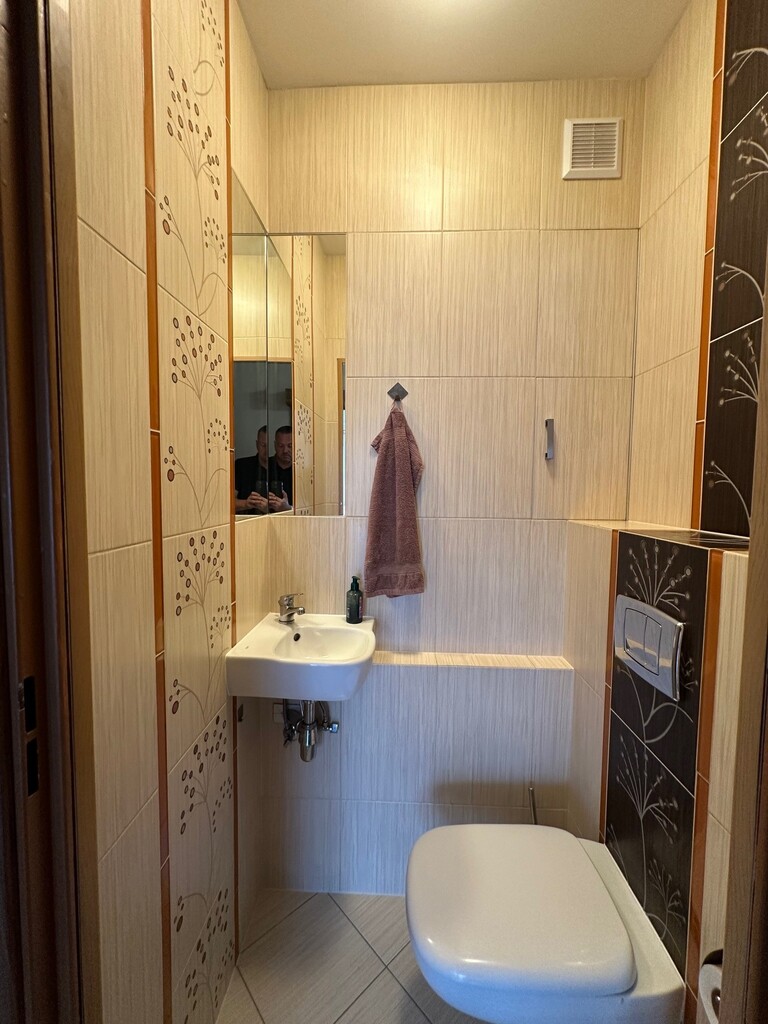 - WC z umywalką, wykończone w płytkach nowszego typu