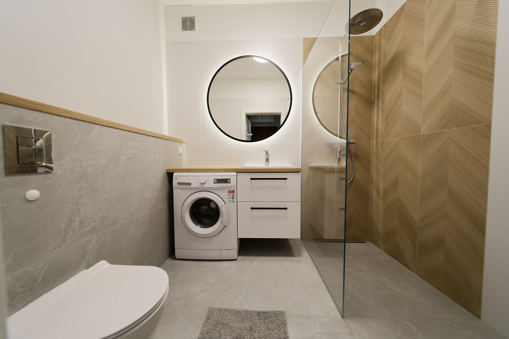 ustęp, umywalka, kabina prysznicowa walk-in, pralka