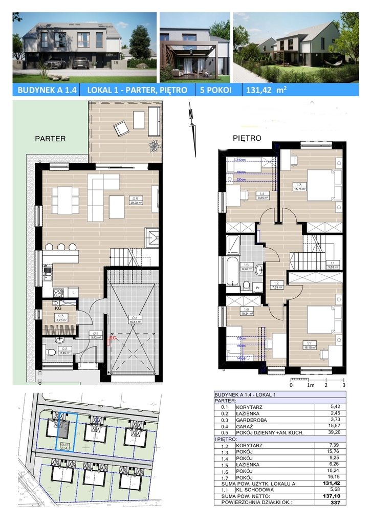 Oferuję na sprzedaż ładny, funkcjonalny bliźniak z garażem w stanie deweloperskim na kameralnym osiedlu w Dobrej, o powierzchni 137,1m2 położony na działce o powierzchni 377m2. Dojazd do osiedla jest drogą z kostki brukowej. Są z podjazdami i ogrodzeniem. Budynek jest zbudowany w standardzie deweloperskim, z rekuperacją, z możliwością montażu instalacji hybrydowej oraz z podwójną ścianą wewnętrzną zapewniającą komfort. Na parterze znajduje się przestronny salon z aneksem kuchennym o powierzchni (43,70)m2, łazienka (3,30)m2, garderoba (5,18)m2, korytarz (4,36)m2. Na piętrze znajdują się trzy pokoje ( 11,39, 9,99, 14,99)m2, garderoba ( 3,48)m2, łazienka (6,41)m2, korytarz ( 4,92)m2, klatka schodowa (4,42)m2.W wyposażeniu piec gazowy z możliwością zamiany na pompę ciepła za dopłatą. brama garażowa ocieplana z napędem elektrycznym. Przygotowane są również puszki pod montaż rolet antywłamaniowych. Segment posiada 2 miejsca parkingowe. Serdecznie zapraszam na prezentację.
