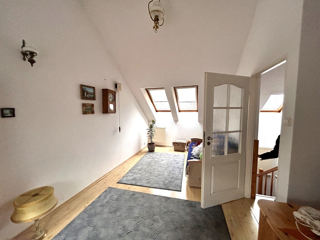 I poziom: salon z wyjściem na duży balkon, kuchnia (aktualnie jako osobne pomieszczenie), wc