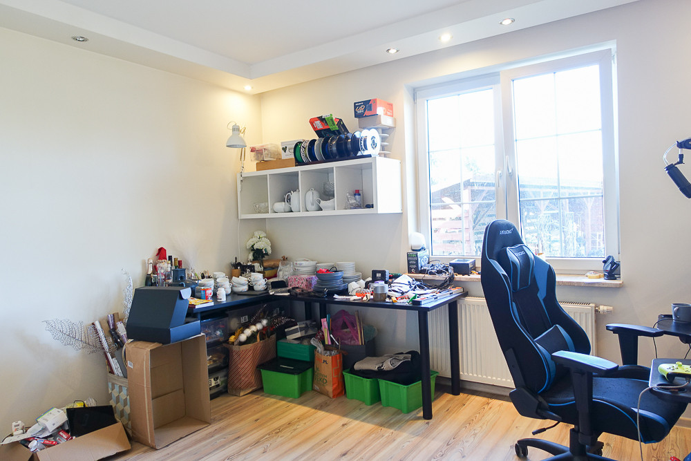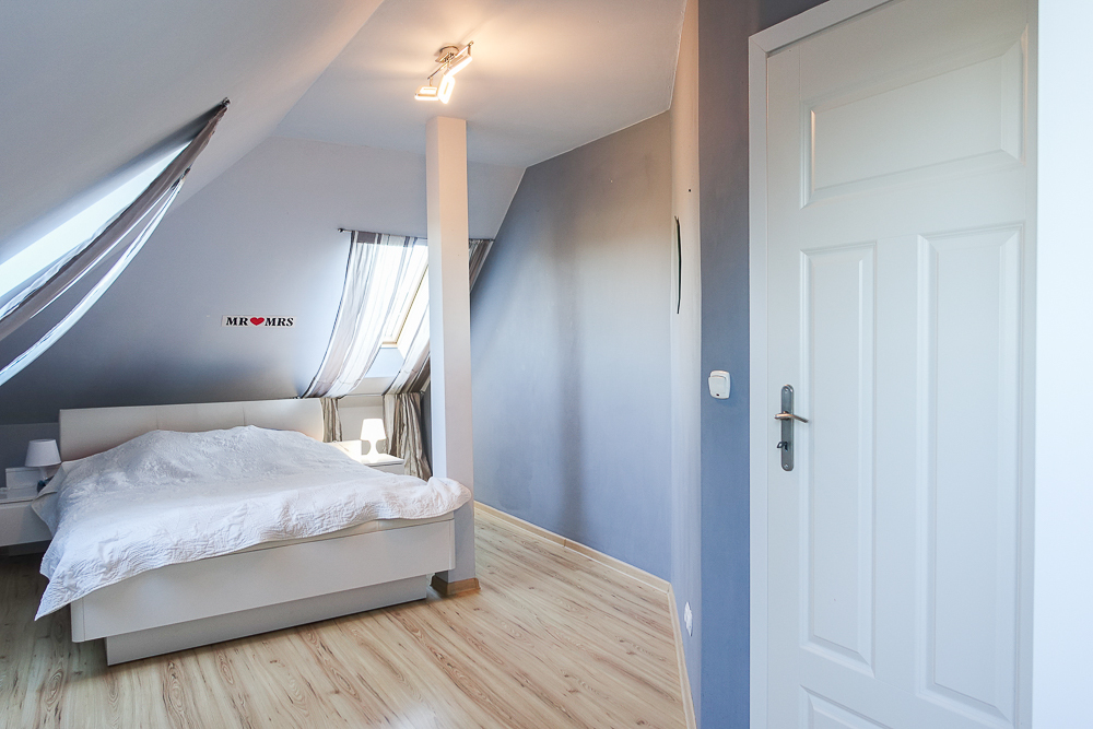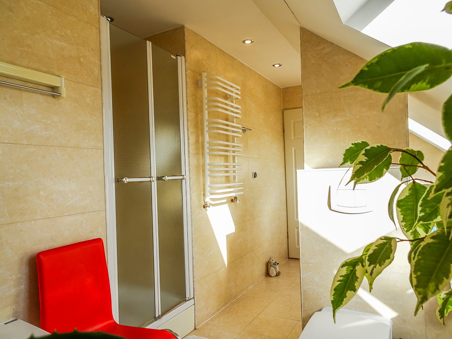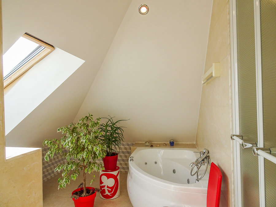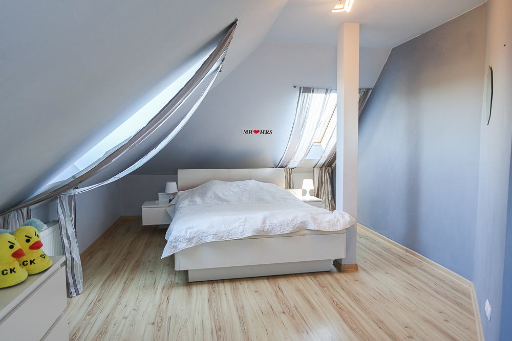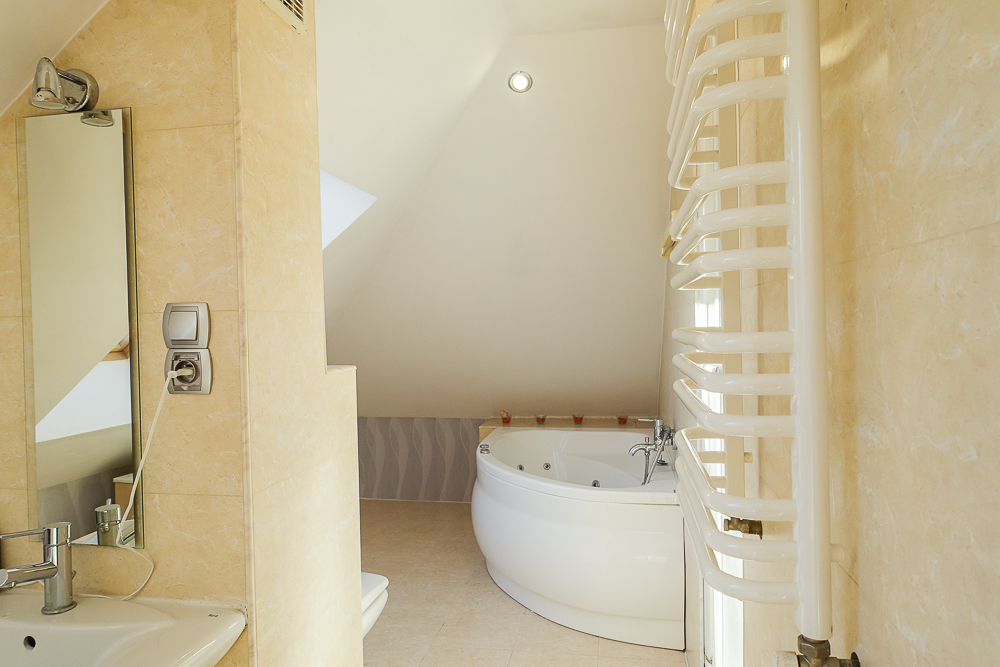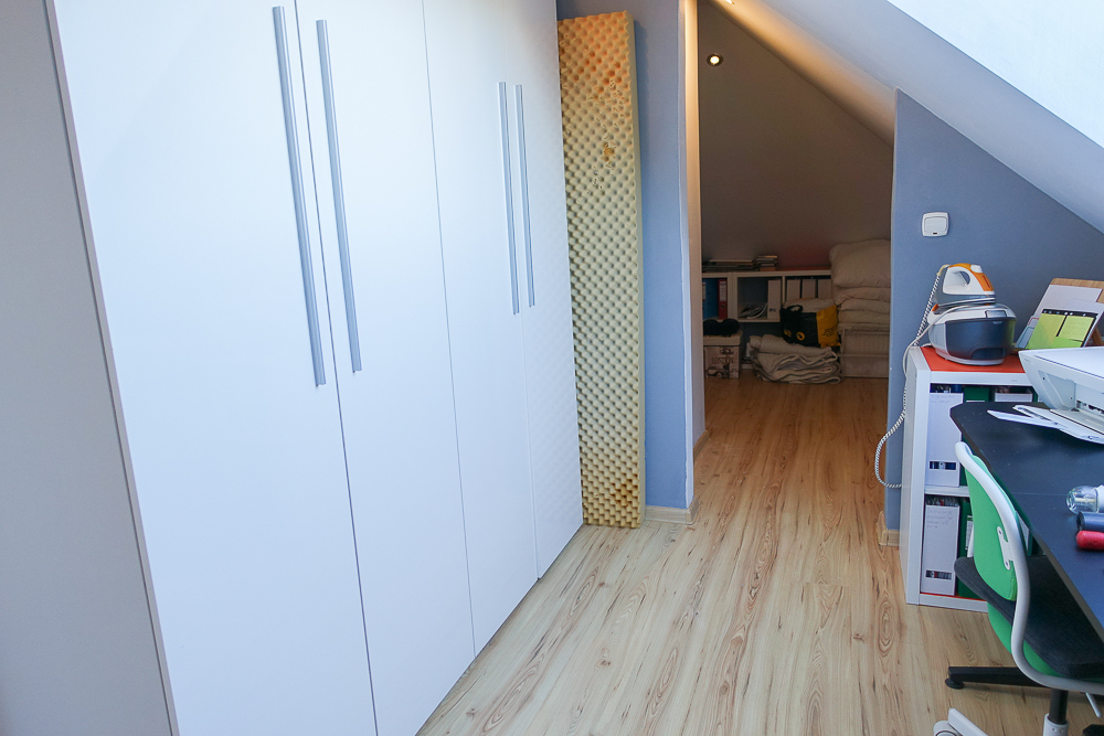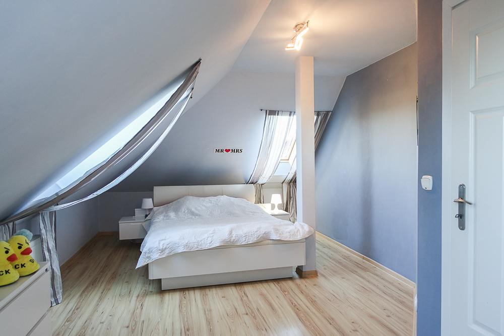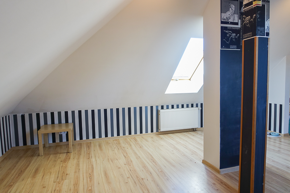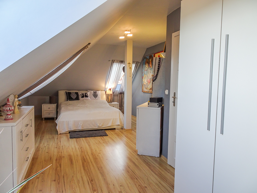 PIĘTRO ze skosami: pokój o powierzchni użytkowej 11,63 m2 po podłodze około 20 m2 i sypialnia po podłodze ok. 20 m2 z wejściem do garderoby, i pomieszczenie gospodarcze. Łazienka 4 m2 po podłodze ok. 10 m2 w niej wanna narożna, kabina prysznicowa, umywalka WC razem. W łazience okno, jasna glazura i terakota, średnie rachunki za energię elektryczną 600 zł.