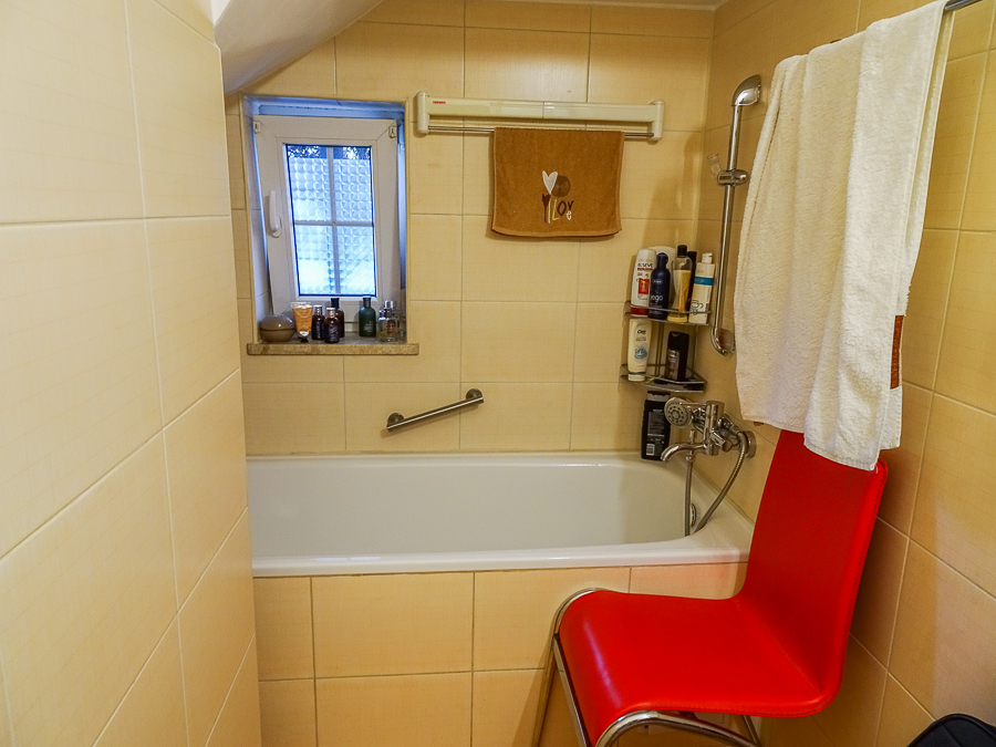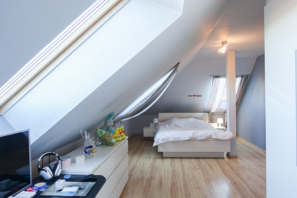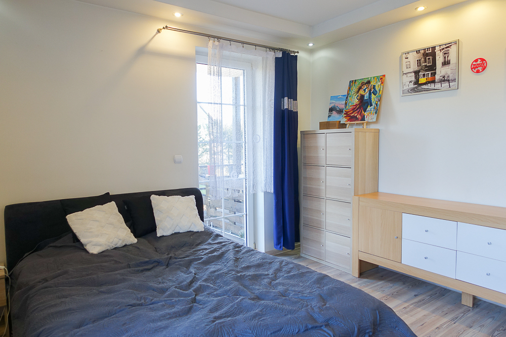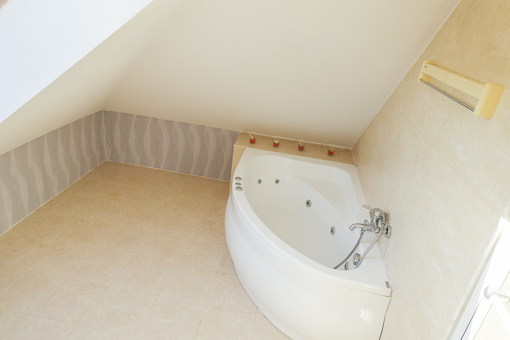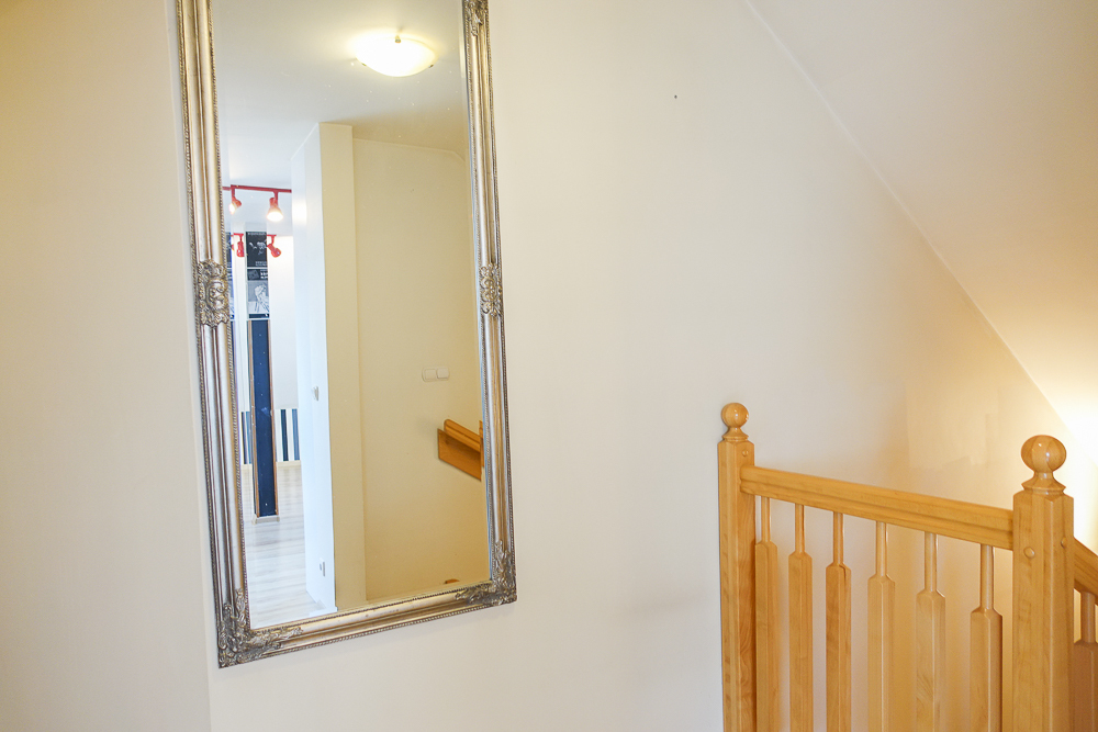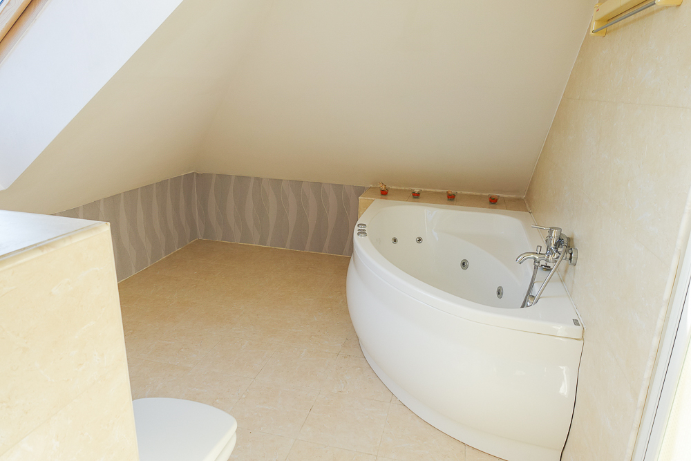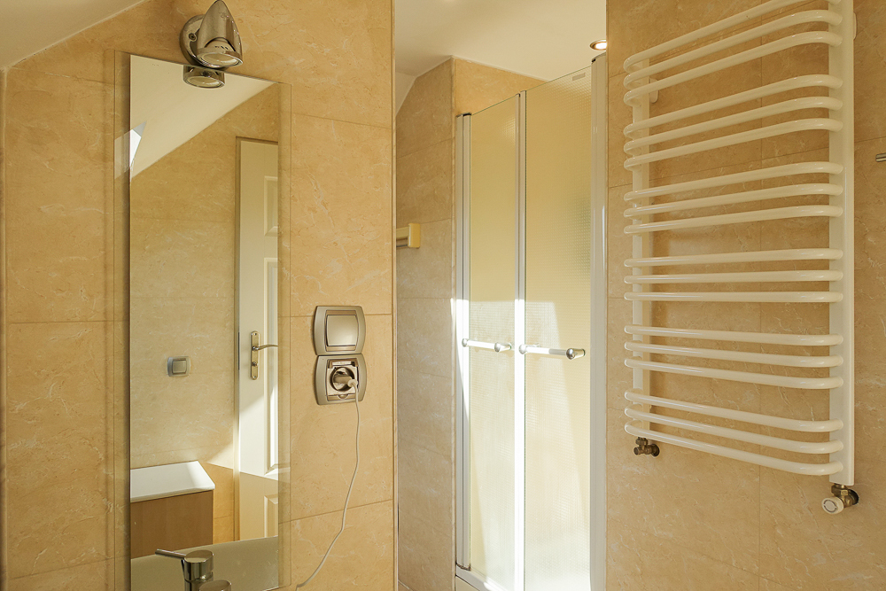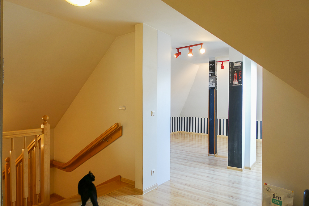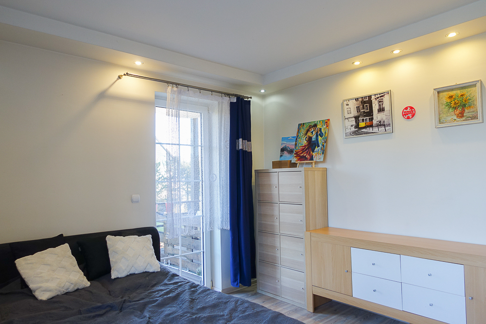 PIĘTRO ze skosami: pokój o powierzchni użytkowej 11,63 m2 po podłodze około 20 m2 i sypialnia po podłodze ok. 20 m2 z wejściem do garderoby, i pomieszczenie gospodarcze. Łazienka 4 m2 po podłodze ok. 10 m2 w niej wanna narożna, kabina prysznicowa, umywalka WC razem. W łazience okno, jasna glazura i terakota, średnie rachunki za energię elektryczną 600 zł.