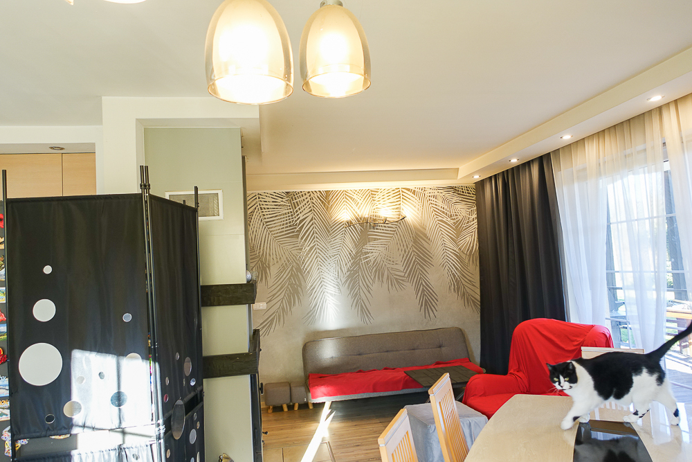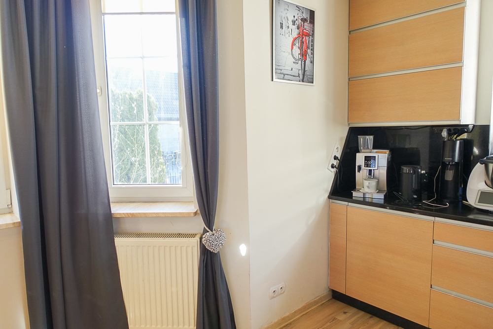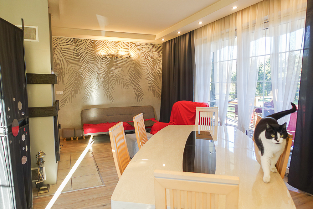 PARTER: salon 24 m2 z wyjściem na taras drewniany o pow. ok. 15 m2 i dalej do pięknie utrzymanego ogrodu z drzewami i krzewami oddzielającymi ogród od ulicy i sąsiednich budynków. Salon otwarty na aneks kuchenny o powierzchni 6 m2 z nowoczesną zabudową i urządzeniami AGD dodatkowo kominek z płaszczem wodnym. 2 pokoje 14,4 m2 i 15,3 m2. Hall 5,39 m2, łazienka 5,12 m2, klatka schodowa 5 m2, sień 3,69 m2. W łazience wanna i toaleta z umywalką. Ogrzewanie elektryczne i kominkowe.