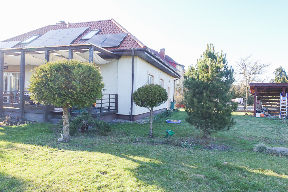 Budynek wybudowany z POROTHERMU, ocieplonego styropianem o grubości 15 cm, dachówka ceramiczna (w zeszłym roku było kompleksowe mycie dachu i konserwacja wystarczająca na 10 lat). W budynku siła 360 kW, woda, oczyszczalnia biologiczna. Możliwość oddzielenia działki 880 m2 i wybudowania drugiego domu. Na działce drewutnia 25 m2, altana w ogrodzie 6 m2. Dużo drzew ozdobnych i owocowych, krzewy, magnolia, liczne nasadzenia. Na dachu fotowoltaika na starych zasadach. Moc instalacji 4,05 kWp.