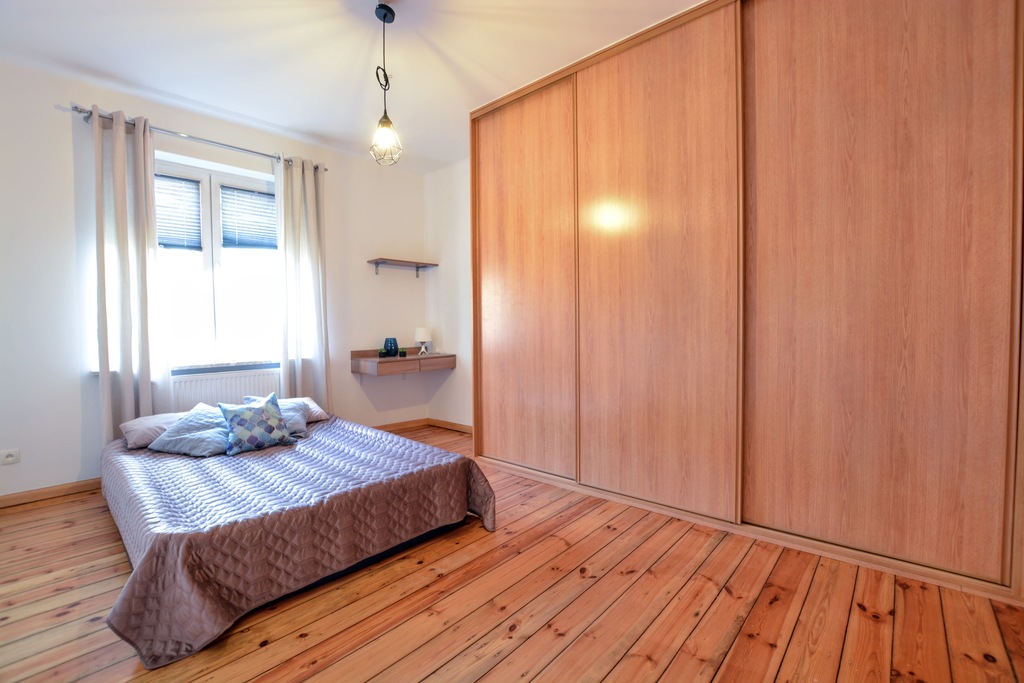 -sypialnia z duża szafą w zabudowie,