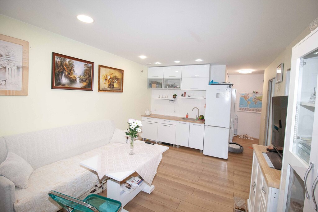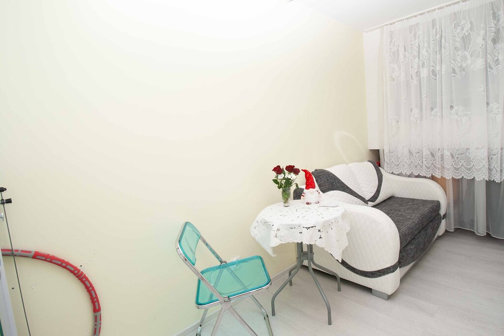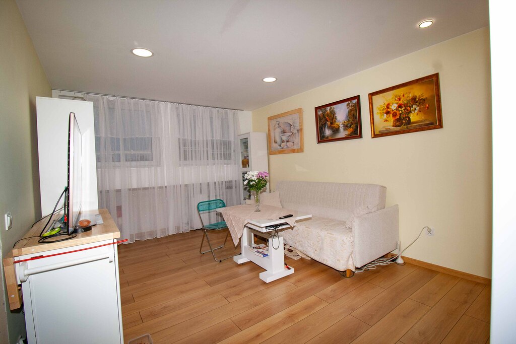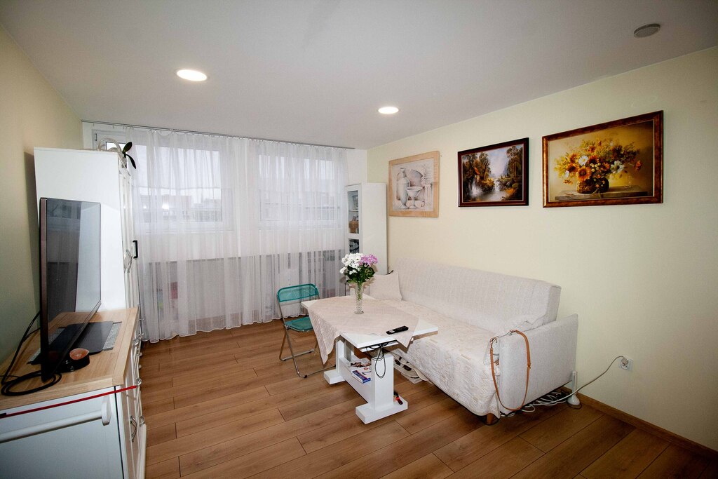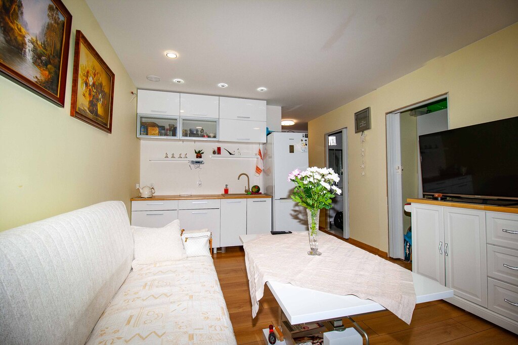 Z dużego pokoju wejście do sypialni. Na podłogach panele, ściany gładzone i malowane. Sufity obniżone z oświetleniem ledowym. Okna PCV. Drzwi zewnętrzne antywłamaniowe. W kuchni meble w zabudowie, lodówko - zamrażalka, płyta indukcyjna. Łazienka z WC - glazura, terakota, wanna osłonięta szybą. W przedpokoju szafa. Stała zabudowa i część mebli może pozostać w cenie nieruchomości.
