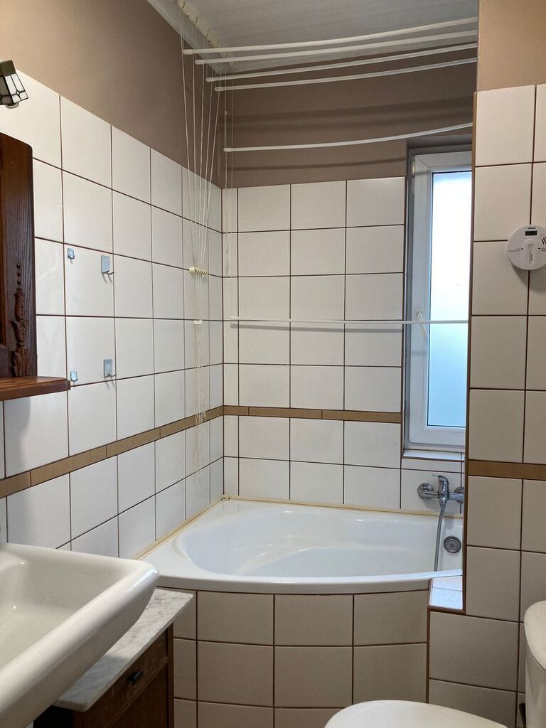 Dwa oddzielne pokoje, jasna kuchnia, łazienka oknem. Na podłogach deska, okna PCV.