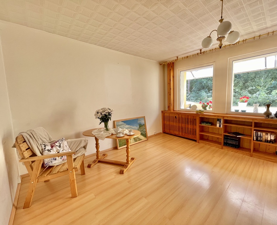 - Salon z wyjściem na balkon od strony południowej, skąd rozciąga się piękny widok na las. To idealne miejsce na wypoczynek po pracy.