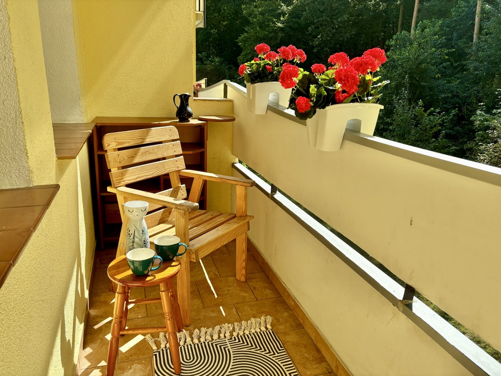 - Przestronny balkon z widokiem na las
