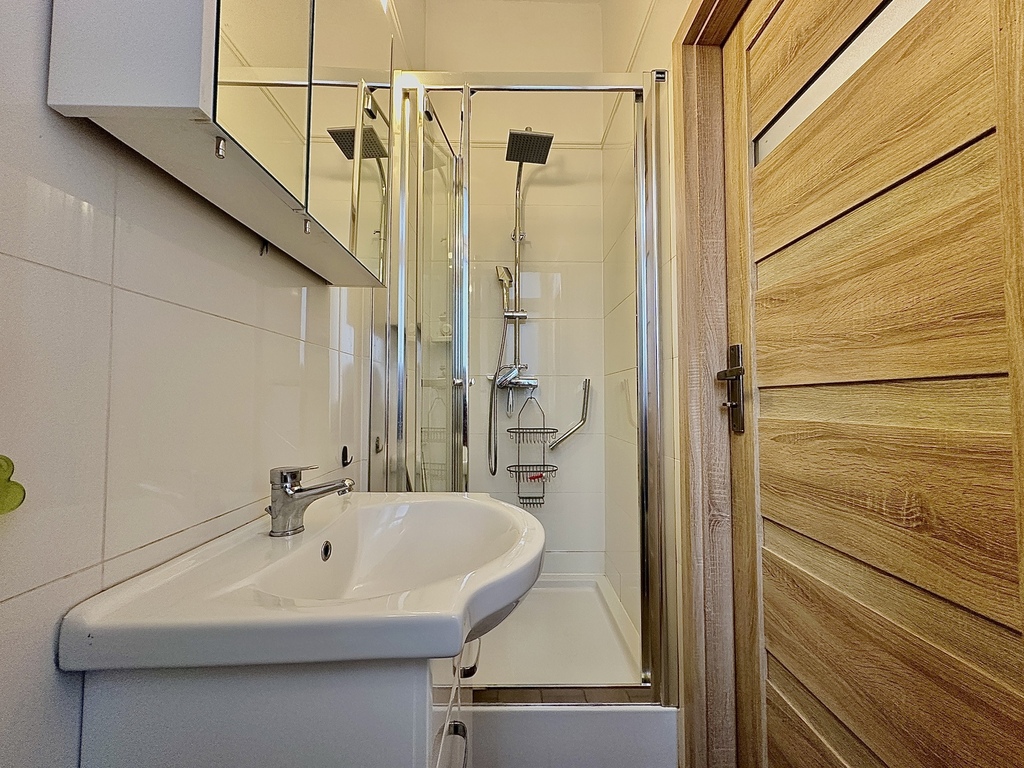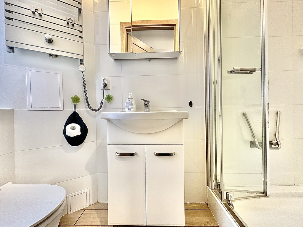 • Łazienka z kabiną prysznicową i podgrzewaną podłogą.