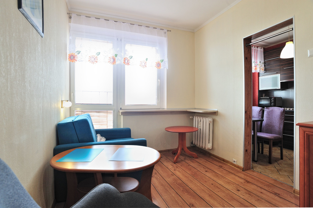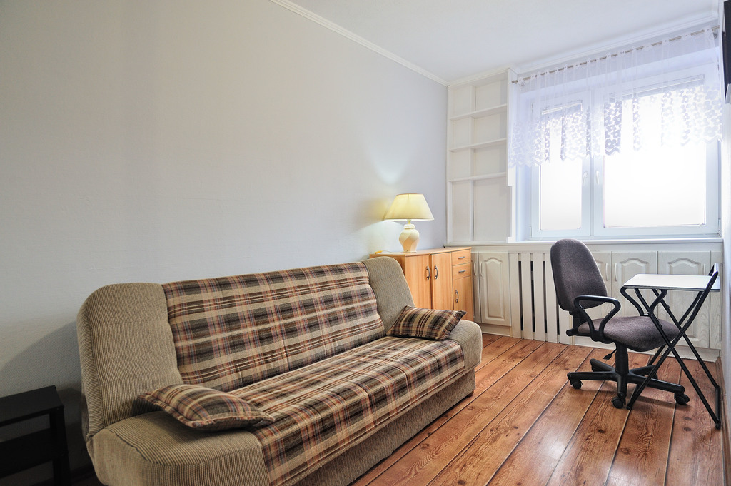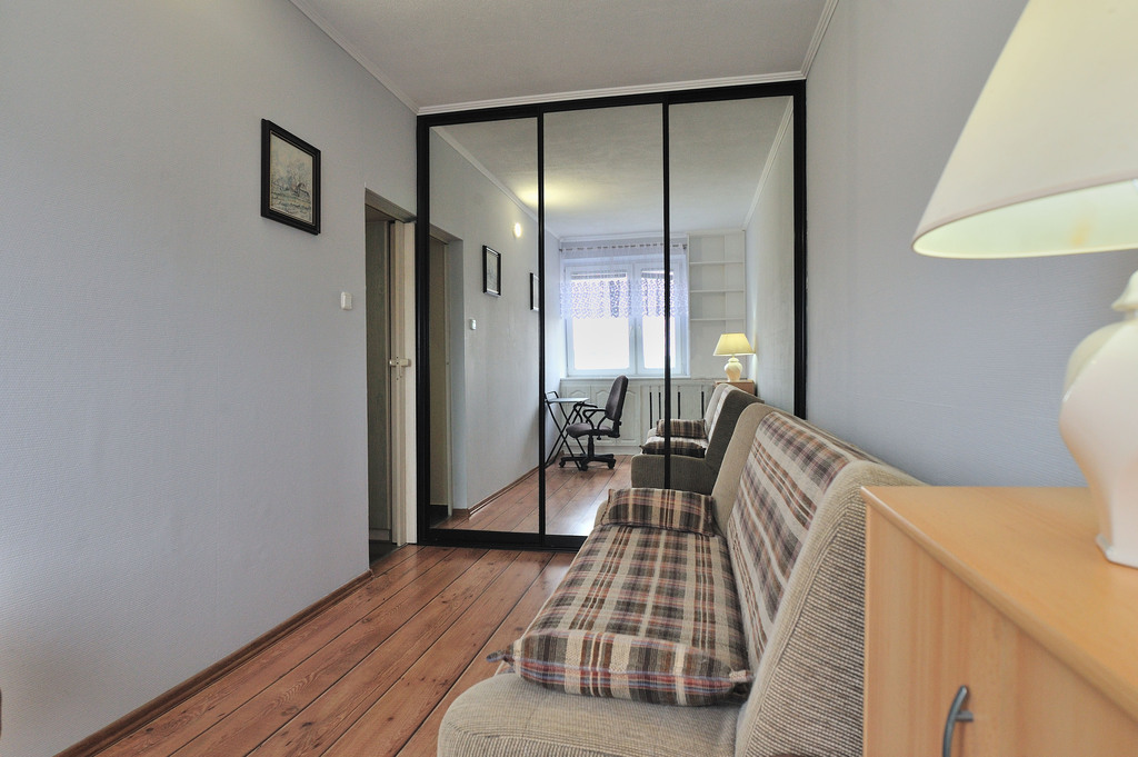 OPIS MIESZKANIA: Do wynajęcia mieszkanie znajdujące się na 7 piętrze XII-piętrowego wieżowca. Jego całkowita powierzchnia wynosi 30,81 m2, jest w pełni umeblowane i wyposażone. W mieszkaniu znajdują się 2 pokoje, w tym jeden przejściowy do oddzielnej słonecznej, wygodnej kuchni. Pierwotnie była to kawalerka, ale została podzielona. W tej sposób mamy część dzienną i część sypialną, ale te pomieszczenia mogą mieć inne funkcje. W pokoju dziennym jest 1 osobowa rozkładana sofa, fotel oraz widoczny stok i komoda. W drugim pokoju jest kanapa, biurko z krzesłem, komoda, stolik oraz bardzo pakowna duża szafa typu komandor.