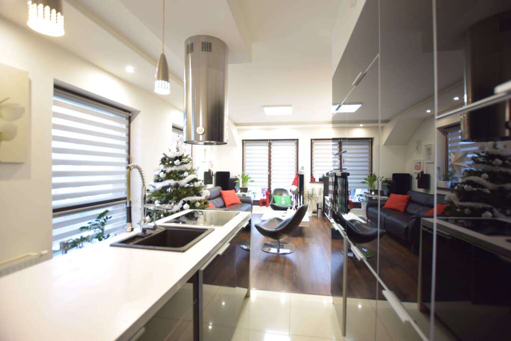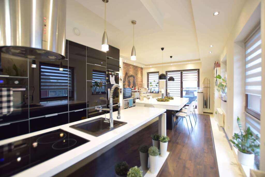 - Salon połączony z jadalnią oraz kuchnią (łącznie ok. 40 m²);