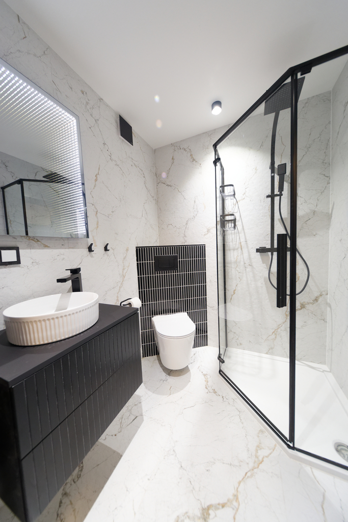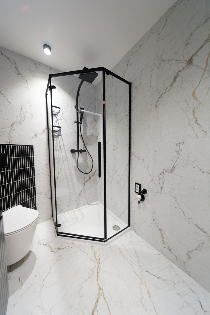 Łazienka: Przestronna, nowoczesna kabina prysznicowa ze szkła na zamówienie, miejsce na pralkę, wykończenie z najwyższej klasy materiałów