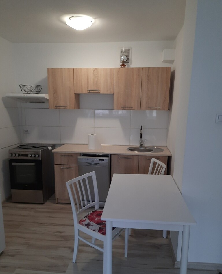 Pełne wyposażenie, kuchnia /aneks kuchenny/ z płytą, piekarnikiem, zmywarką, lodówką, stołem i krzesłami. Salon: kanapa , ława, pufy, komoda, szafa, telewizor. Sypialnia: kanapa, garderoba . Korytarz: szafa. Łazienka: umywalka, wc, kabina, pralka.