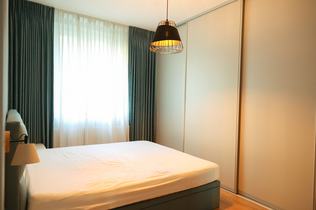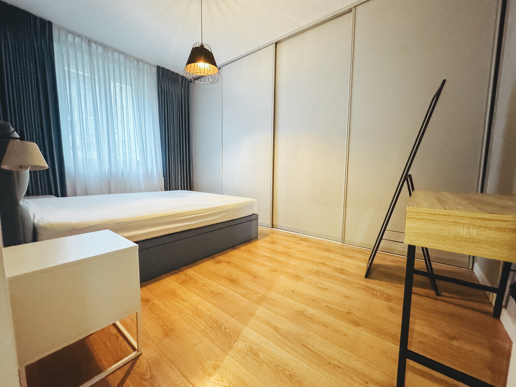 - Sypialnia wyposażona w wygodne łóżko oraz dużą szafę w zabudowie.