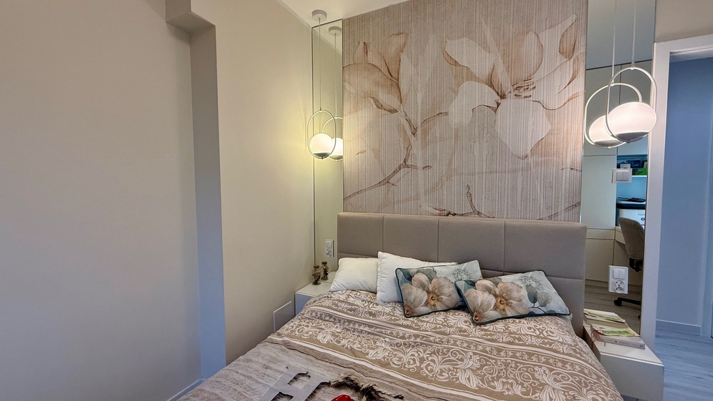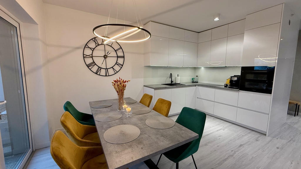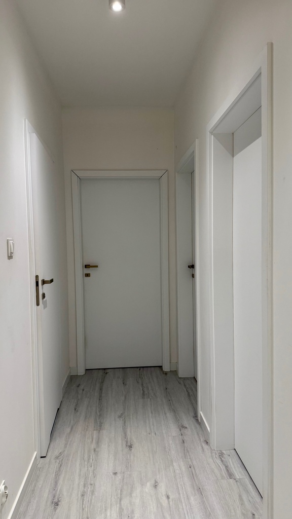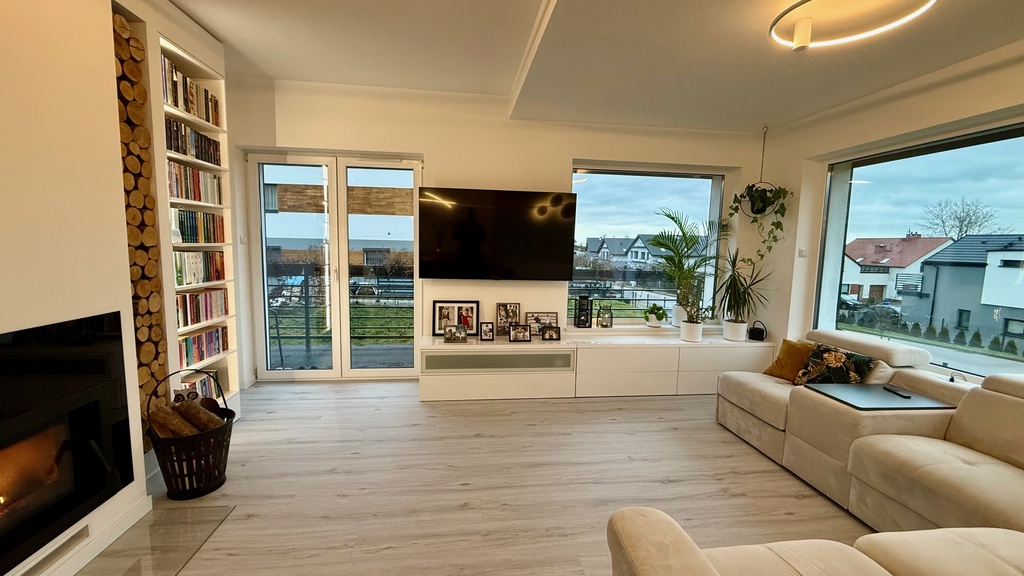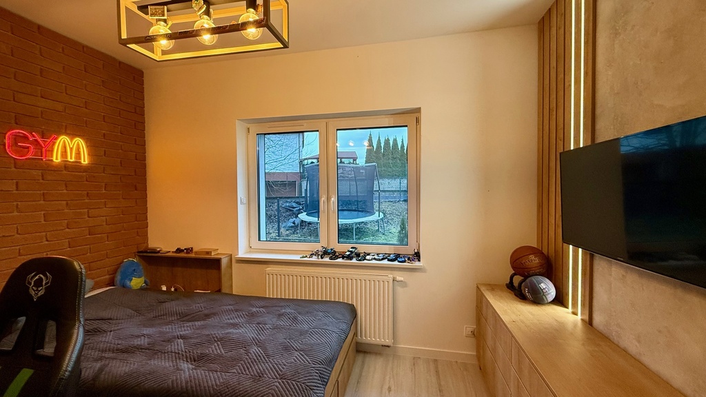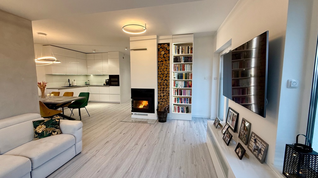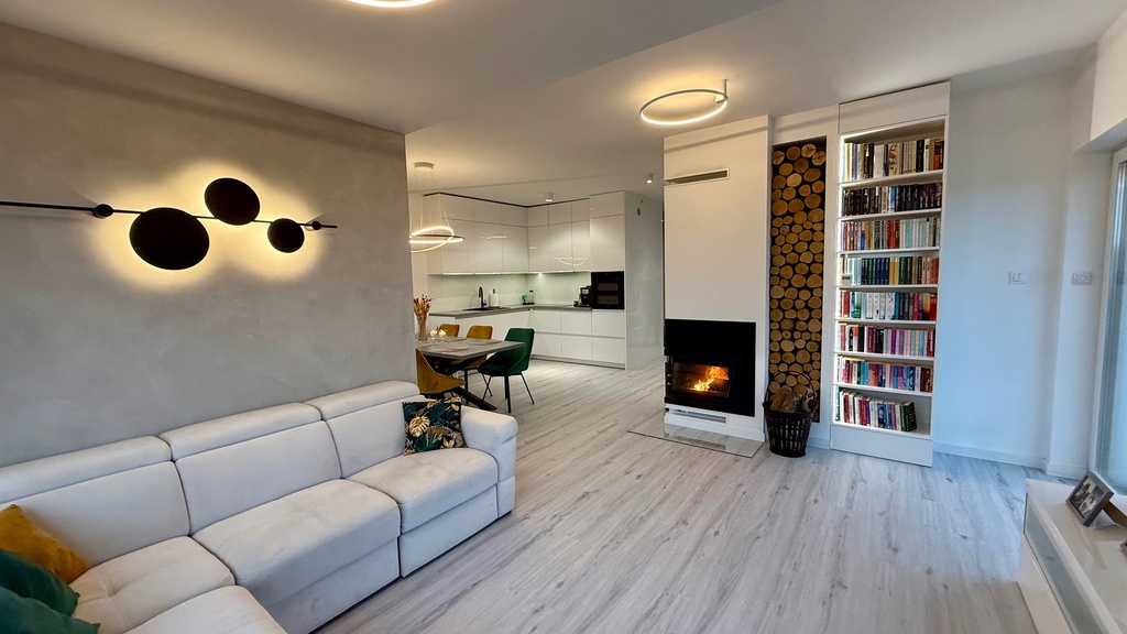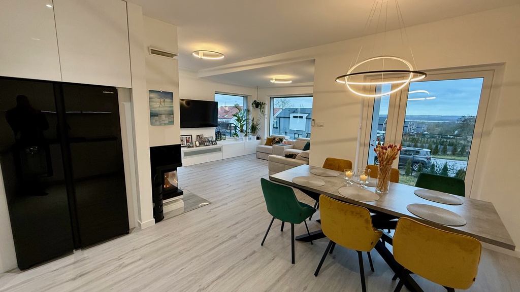 Salon z kuchnią i jadalnią 35,66m2 na podłodze panele winylowe. Sypialnia 12.99m2 wraz z garderobą, pokój gościnny 11,27m2, pokój dziecka 10,63m2.