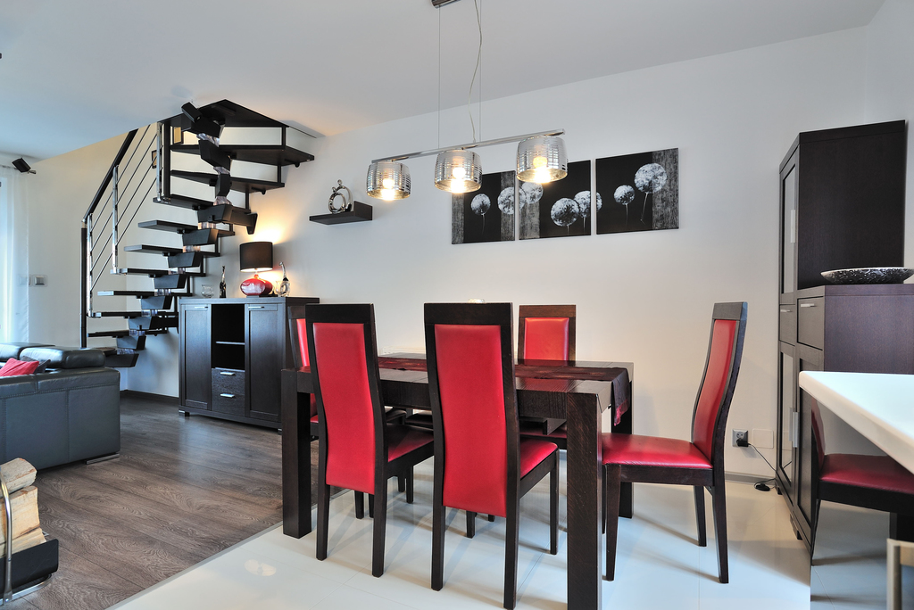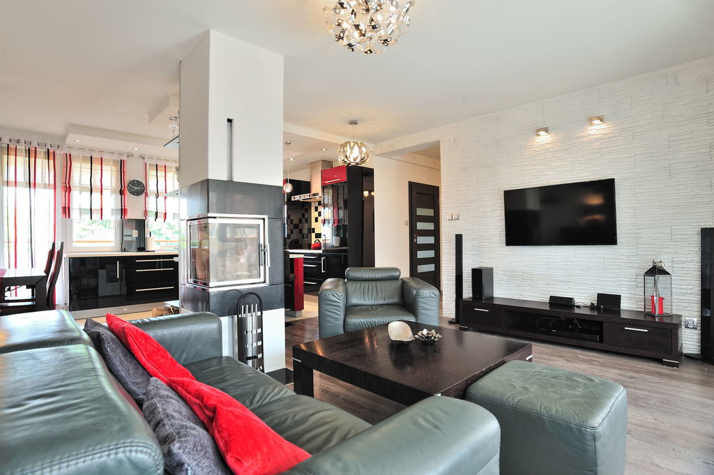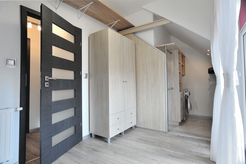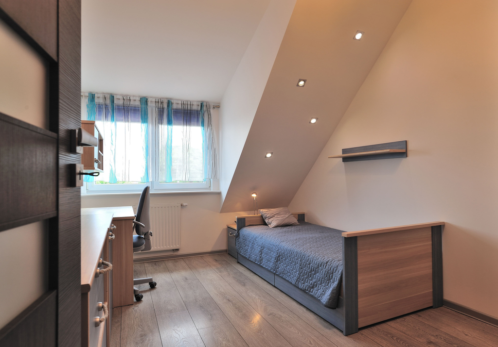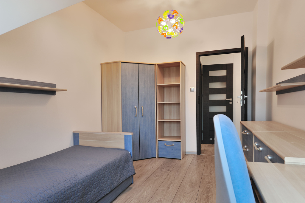 To idealna propozycja dla rodziny ceniącej spokój i bezpieczeństwo, a zarazem dobrą lokalizację i szybki dojazd do pozostałych części miasta. Mieszkanie jest gustownie urządzone, wykończone i umeblowane w bardzo wysokim standardzie. Posiada 5 pokoi, 2 łazienki (po jednej na każdym poziomie), ogród, spory taras i dwa balkony. Na pierwszej kondygnacji znajduje się: przedpokój, pokój (z rozkładaną kanapą, biurkiem z krzesłem obrotowym, komodą, szafkami, małą szafą na ubrania, stolikiem, półką), sypialnia z dużym wygodnym łóżkiem i dwoma szafkami nocnymi, łazienka (z narożną wanną, umywalką, dużym lustrem, bidetem, WC, szafkami, grzejnikiem drabinkowym). Na tym poziomie znajduje się także salon wyposażony w telewizor z zestawem kina domowego, umeblowany w kanapę, pufę, fotel oraz stolik kawowy. Stąd jest też wyjście na duży i słoneczny taras, gdzie znajduje się zestaw rattanowych mebli ogrodowych wraz z huśtawką ogrodową. Salon połączony jest z kuchnią umeblowaną w funkcjonalne meble i wyposażoną w sprzęt AGD (lodówkę z zamrażarką, kuchenkę indukcyjną, czajnik, piekarnik elektryczny, mikrofalówkę). W tej części znajduje się również stół jadalny z krzesłami. Z kuchni jest wyjście na duży balkon. Na wyższym poziomie znajduje się pokój dziecięcy z biurkiem z krzesłem obrotowym, łóżkiem, półkami, szafą na ubrania, szafkami. Jest tu także drugi pokój przeznaczony dla dziecka. Na tym poziomie znajduje się również łazienka z WC, kabiną prysznicową, umywalką z lustrem i półkami na kosmetyki. Jest tu także garderoba i miejsce gospodarcze z pralką z wyjściem na mały balkon. Mieszkanie w pełni umeblowane i wyposażone. Do mieszkania przynależy także ogród z zestawem mebli ogrodowych i garaż.