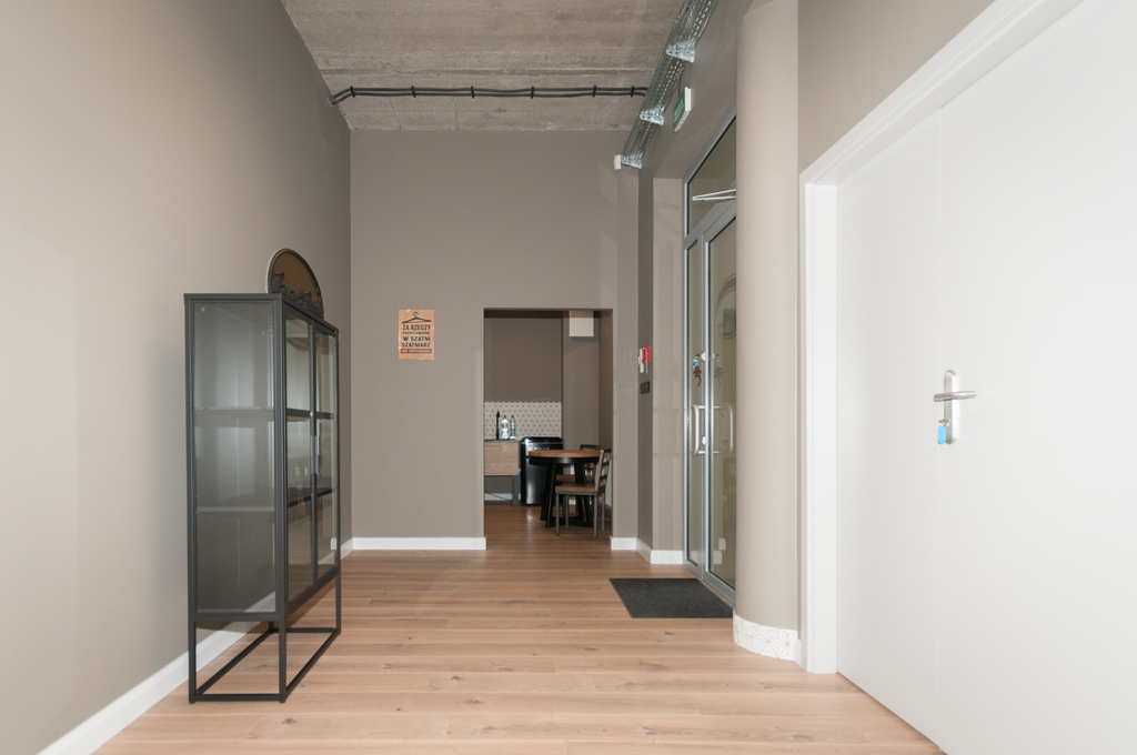 Lokal zajmuje część pierwszego piętra i składa się z duże otwartej powierzchni, pomieszczenia socjalnego/kuchenka. Z korytarza dostęp do sanitariatów dostępnych dla najemców 1 piętra, a także dostęp do pomieszczenia magazynowego (ok. 60mkw).