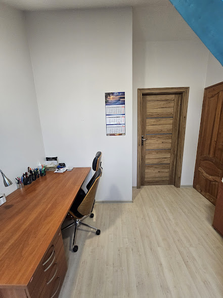 Parter: mały korytarz (3m2), holl (9,7m2), przestronny salon (38,2 m2) z kominkiem i wyjściem na taras ok (17m2) i na ogród, sypialnia (14,3m2), otwarta kuchnia (11,2m2) z oknem, łazienka z WC (6,8m2) z umywalką i wanną narożną, pomieszczenie techniczne - spiżarnia (6,8m2) z piecem gazowym 2-u biegowym, garaż (15m2) z bramą automatyczną Hormann i wejściem do domu. Na piętro prowadzą drewniane schody gdzie są dwa pokoje, dwie garderoby, łazienka z umywalką prysznicem i WC, duże schowki na kartony i inne rzeczy co daje łączną powierzchnię 64,4m2 a użytkowa 50 m2. Wszystkie pomieszczenia pokoje łazienka posiadają okna połaciowe co bardzo naświetla tą przestrzeń. Na pierwszym piętrze kaloryfery i ogrzewanie z kominka.