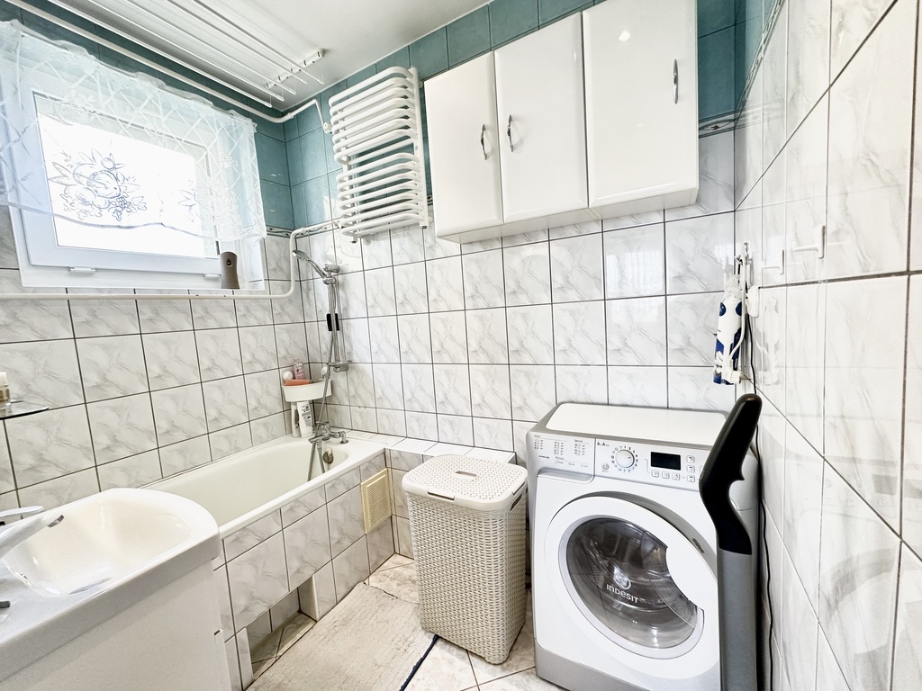 Łazienka z oknem, wanną, umywalką i pralką. WC osobno.