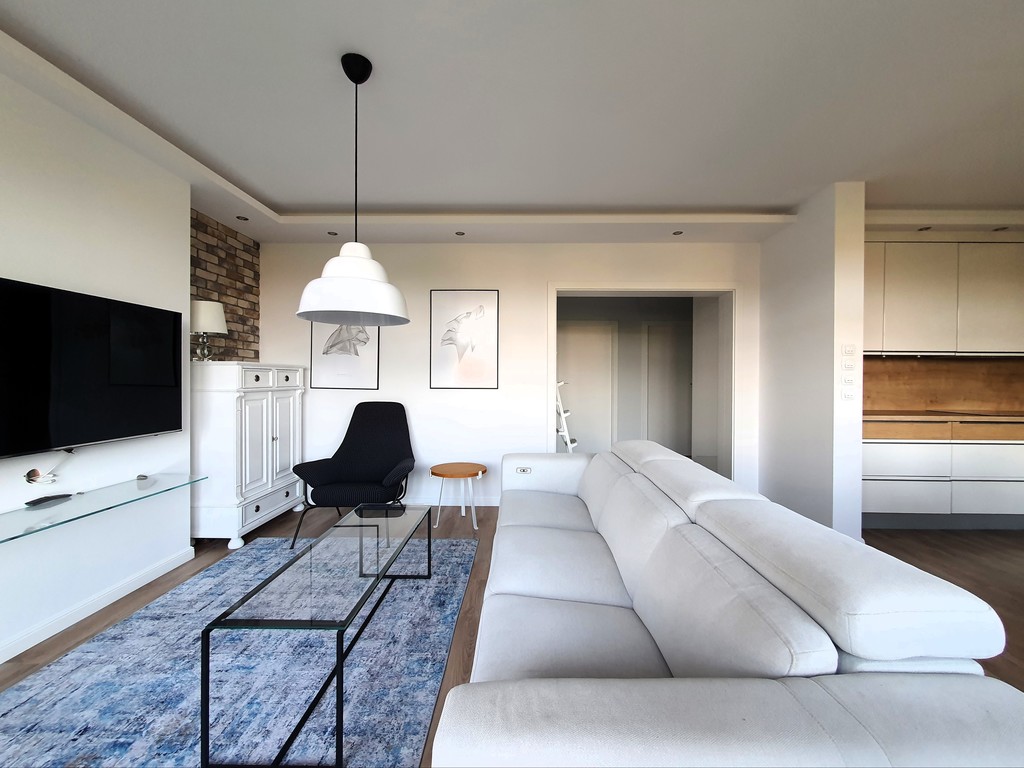 - przestronnego salonu z aneksem wyposażonego w wysokiej klasy sofę z funkcją relaks, TV LCD Samsung, funkcjonalne komody, fotel i stolik kawowy. Pomieszczenie jest bardzo przestronne, doświetlone przez dwa bardzo duże okna oraz drzwi podwójne balkonowe wyposażone w elektrycznie sterowane rolety antywłamaniowe. Aneks posiada zabudowę na wymiar, a na wyposażeniu markowe sprzęty AGD (lodówko-zamrażarka, piekarnik, płyta indukcyjna, zmywarka). Między aneksem a salonem znalazło się również miejsce na stół jadalniany z czterema krzesłami. Na wyposażeniu kuchni znajdziemy kubki, szklanki, zastawę stołową, sztućce, garnki itp.