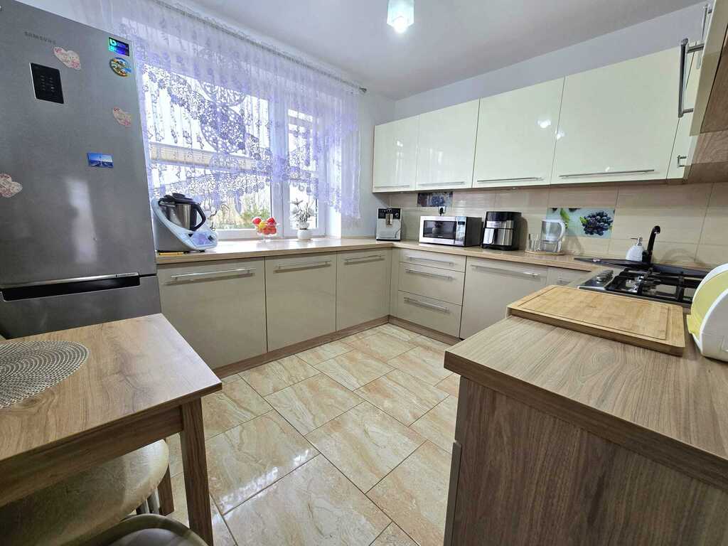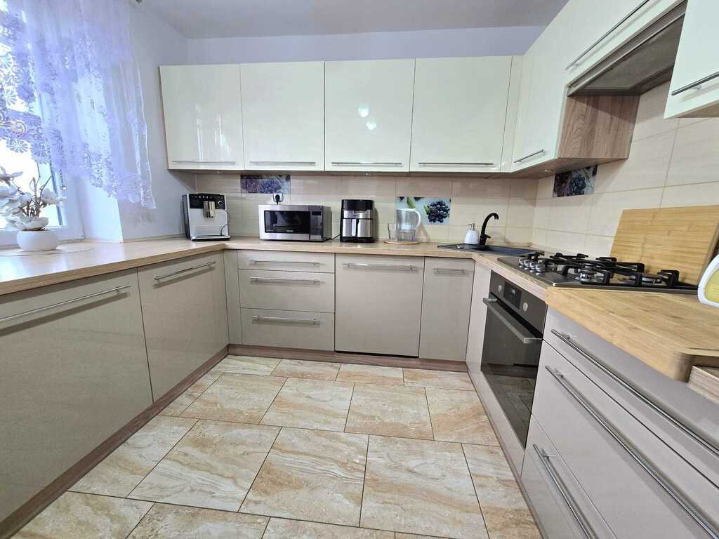 Kuchnia jest w pełni wyposażona w wysokiej klasy meble w zabudowie oraz wszystkie niezbędne sprzęty AGD – gotowa do użytkowania.