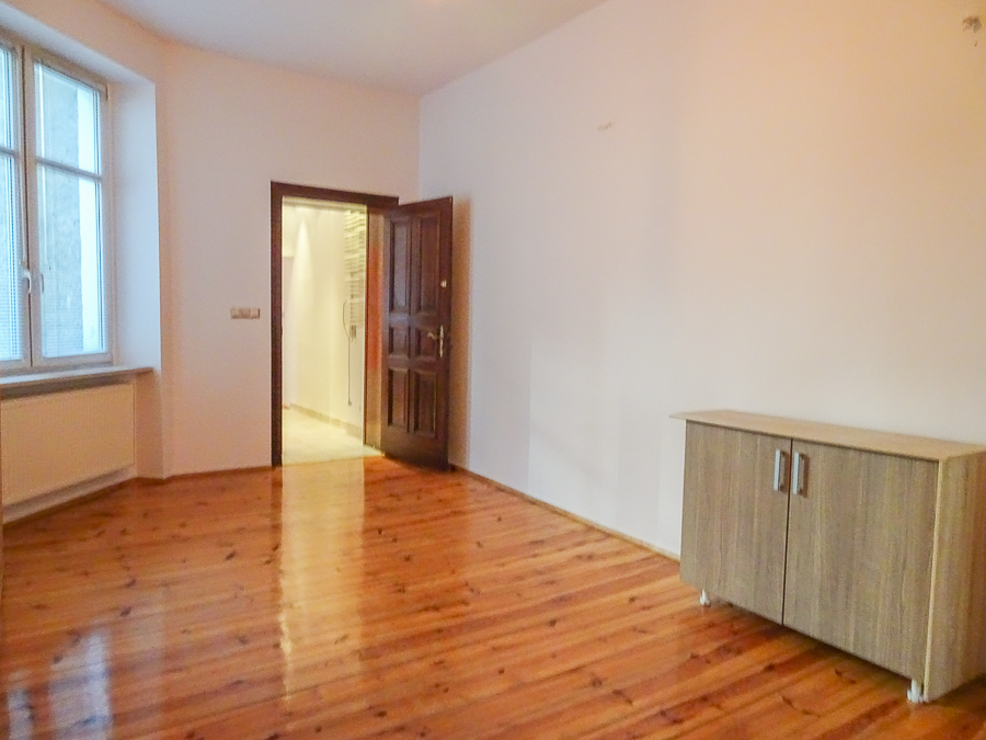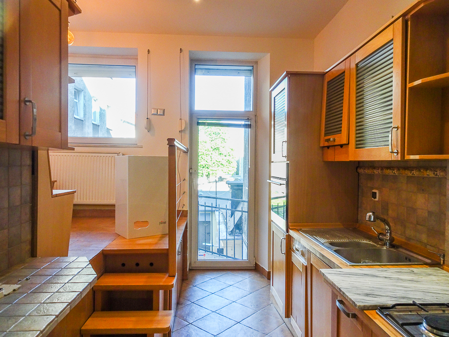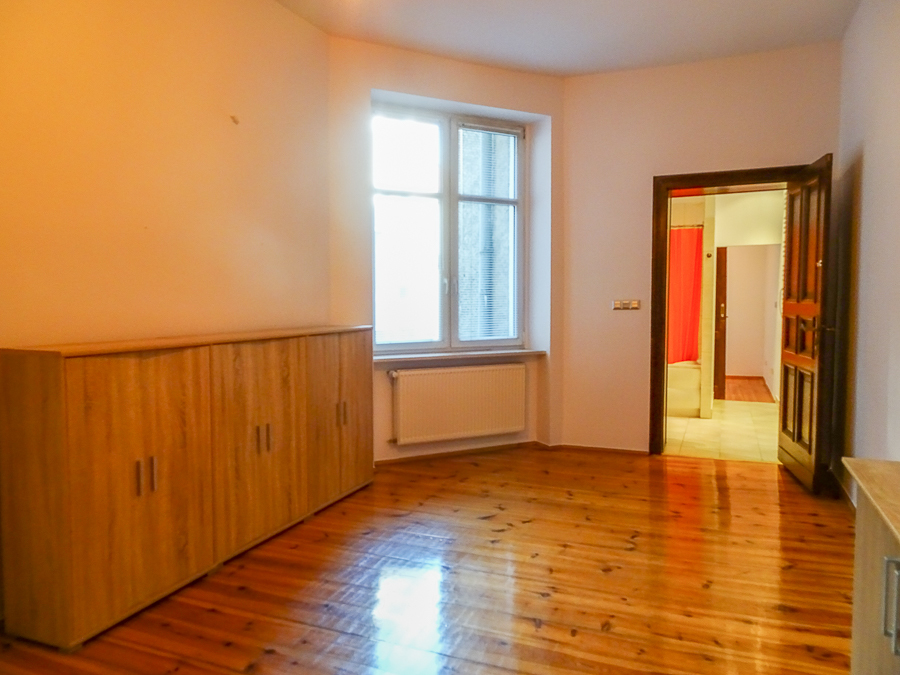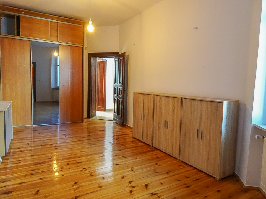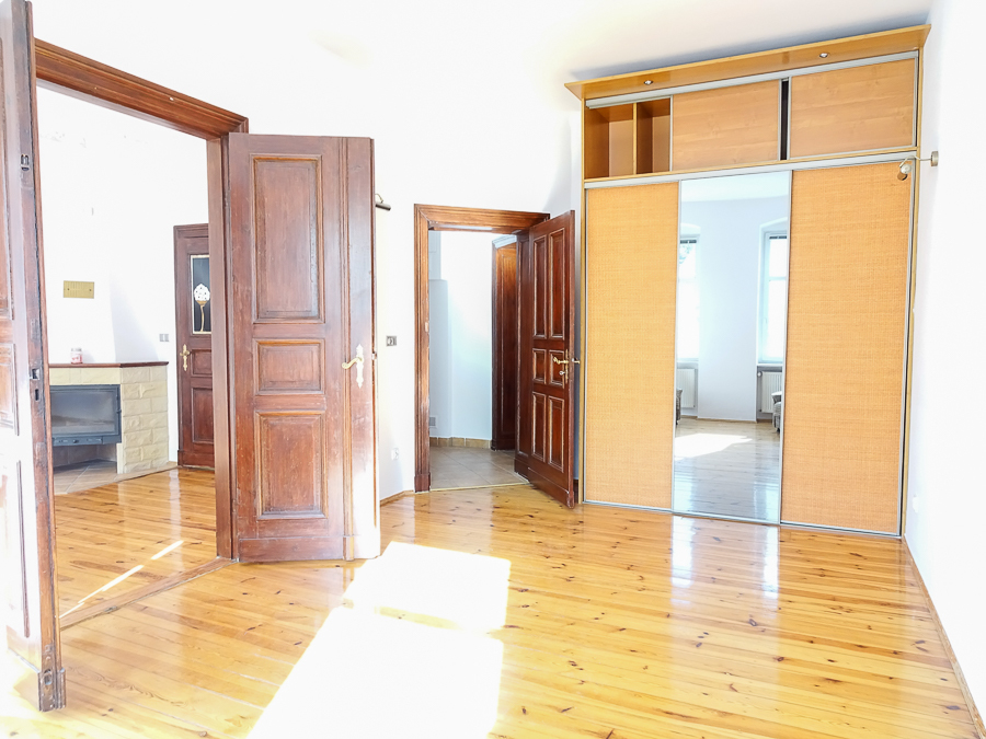 Center, in a well-kept tenement house on the first floor, apartment after major renovation with original stucco in one room and preserved door joinery, restored with original door handles and stained glass. Atmospheric and comfortable apartment. Height 3.25 m. Replaced electrical, heating, water and sewage installations, smooth walls, freshly painted. Rooms with an area of 22.02 m2 with a fireplace, 22.7 m2, 22 m2, 8.18 m2, from the third room passage to the bathroom, and from it to the 4th room. From the room exit to the balcony from the street side, from the kitchen exit to the balcony from the side of the well-kept yard. In the kitchen, built-in furniture, kitchen area 9.6 m2. In the bathroom with an area of 5 m2, window, bathtub, washbasin, toilet. Small room at the entrance with an area of 4.96 m2, which can be a wardrobe or study. New windows, PVC with window sills made of marble conglomerate. Anti-burglary entrance door, alarm system. Very interesting for living and for an office.