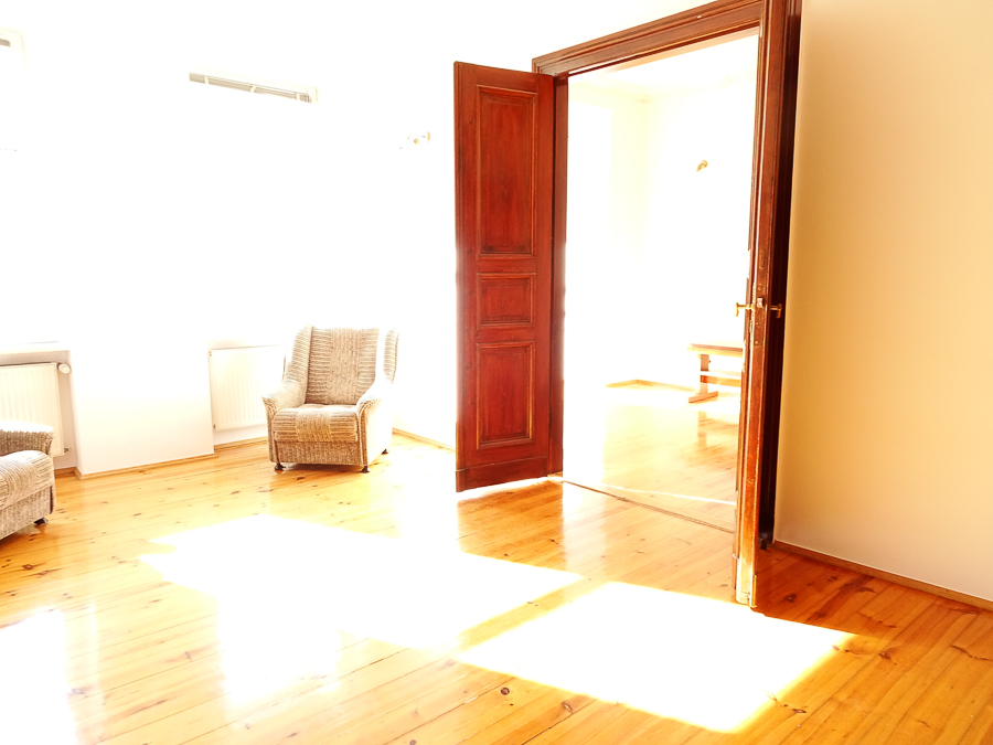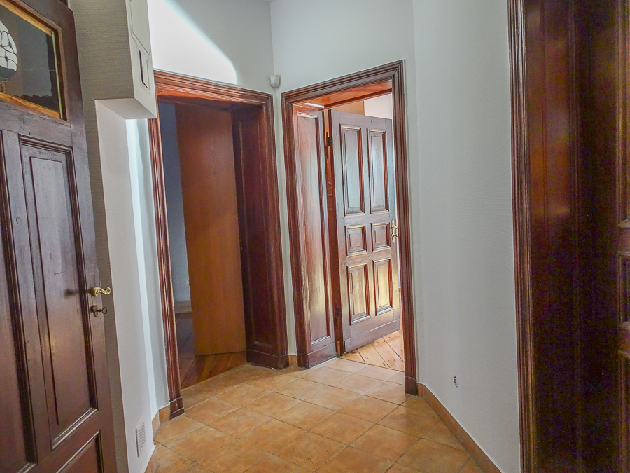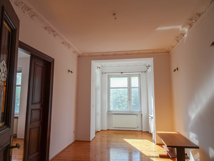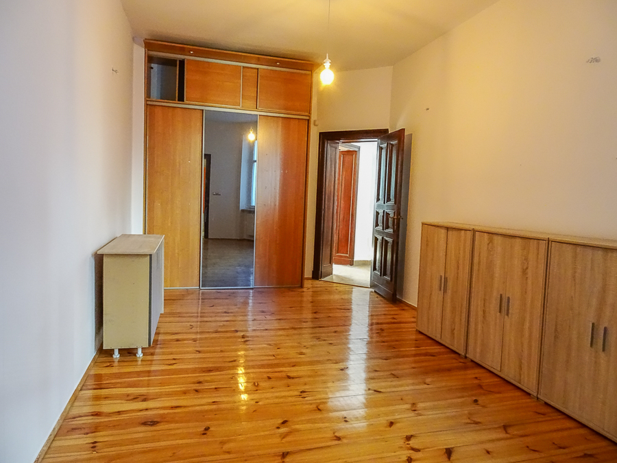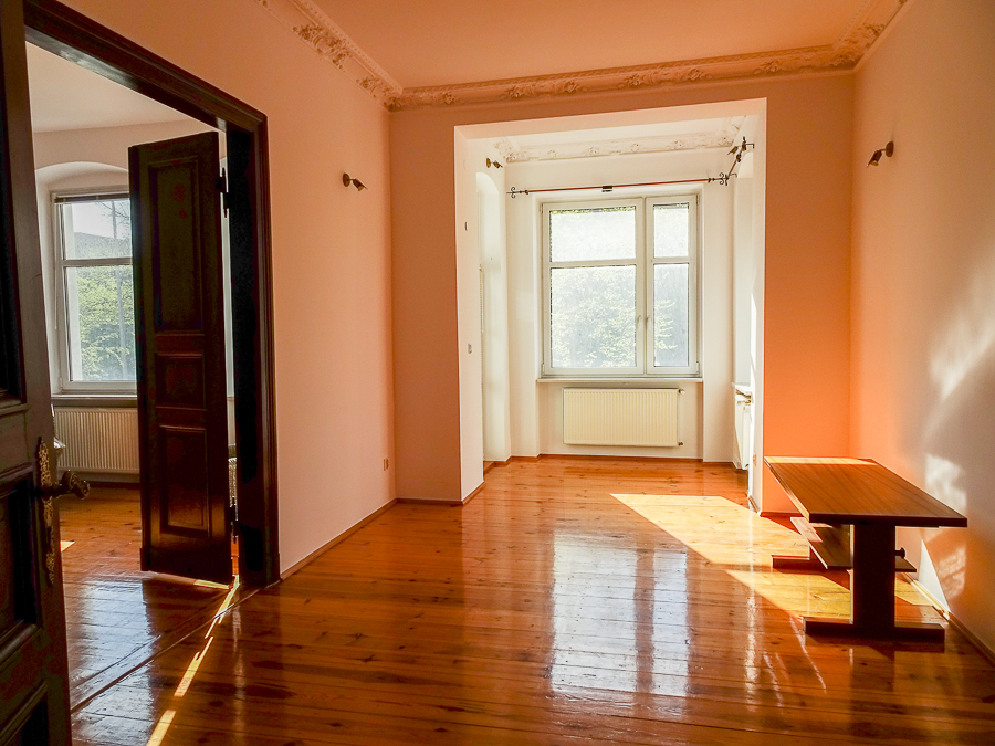 Center, in a well-kept tenement house on the first floor, apartment after major renovation with original stucco in one room and preserved door joinery, restored with original door handles and stained glass. Atmospheric and comfortable apartment. Height 3.25 m. Replaced electrical, heating, water and sewage installations, smooth walls, freshly painted. Rooms with an area of 22.02 m2 with a fireplace, 22.7 m2, 22 m2, 8.18 m2, from the third room passage to the bathroom, and from it to the 4th room. From the room exit to the balcony from the street side, from the kitchen exit to the balcony from the side of the well-kept yard. In the kitchen, built-in furniture, kitchen area 9.6 m2. In the bathroom with an area of 5 m2, window, bathtub, washbasin, toilet. Small room at the entrance with an area of 4.96 m2, which can be a wardrobe or study. New windows, PVC with window sills made of marble conglomerate. Anti-burglary entrance door, alarm system. Very interesting for living and for an office.