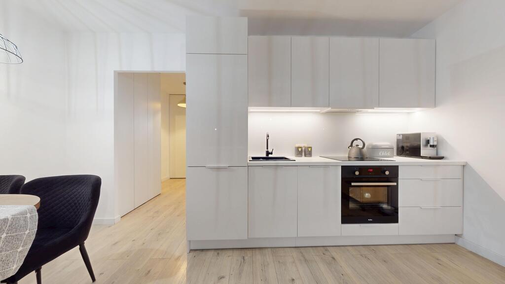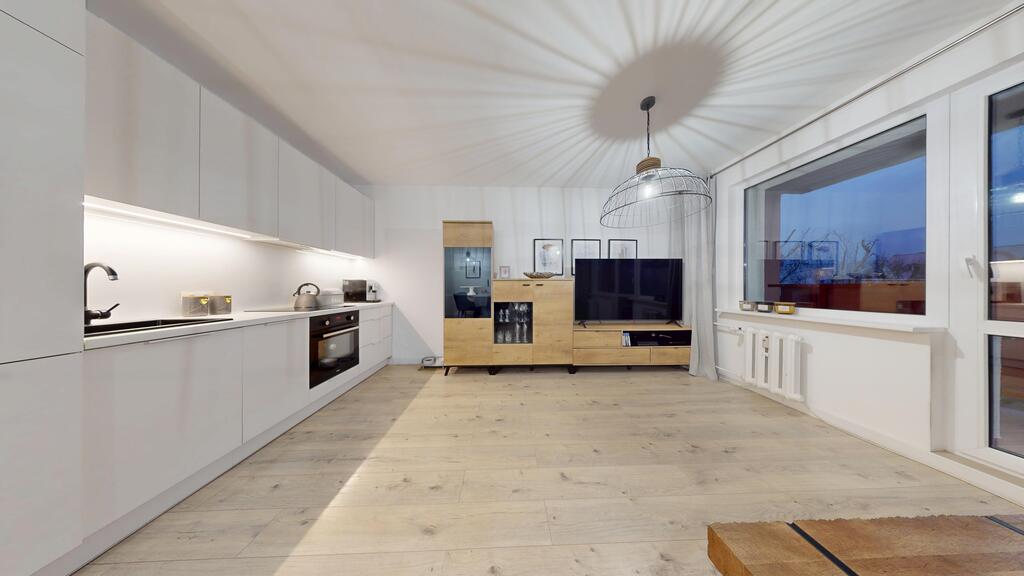 W salonie znajduje się aneks kuchenny z nowoczesnymi, białymi meblami w zabudowie robionej na wymiar. Stąd też wychodzi się na naprawdę duży i słoneczny balkon od strony południowej z widokiem na ciche podwórko.