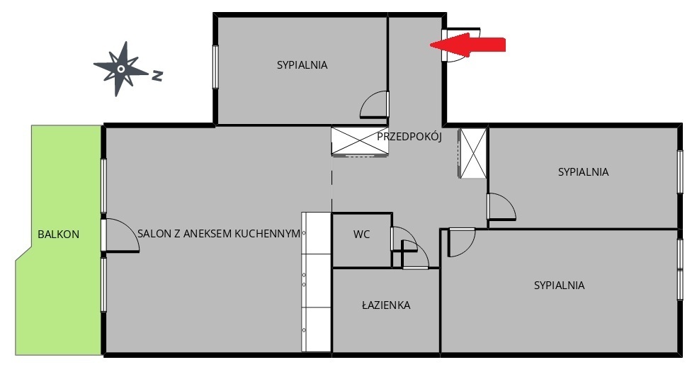 Pierwotnie mieszkanie było 3-pokojowe i tak to widnieje w księdze wieczystej. Obecni właściciele przenieśli kuchnię do salonu zyskując dodatkową sypialnię.