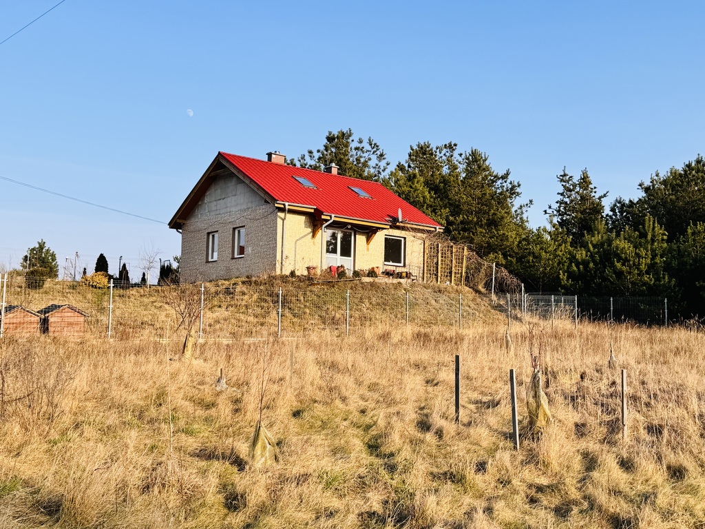 Dom cudownie posadowiony na niewielkim wzgórzu z widokiem na pola i lasy.