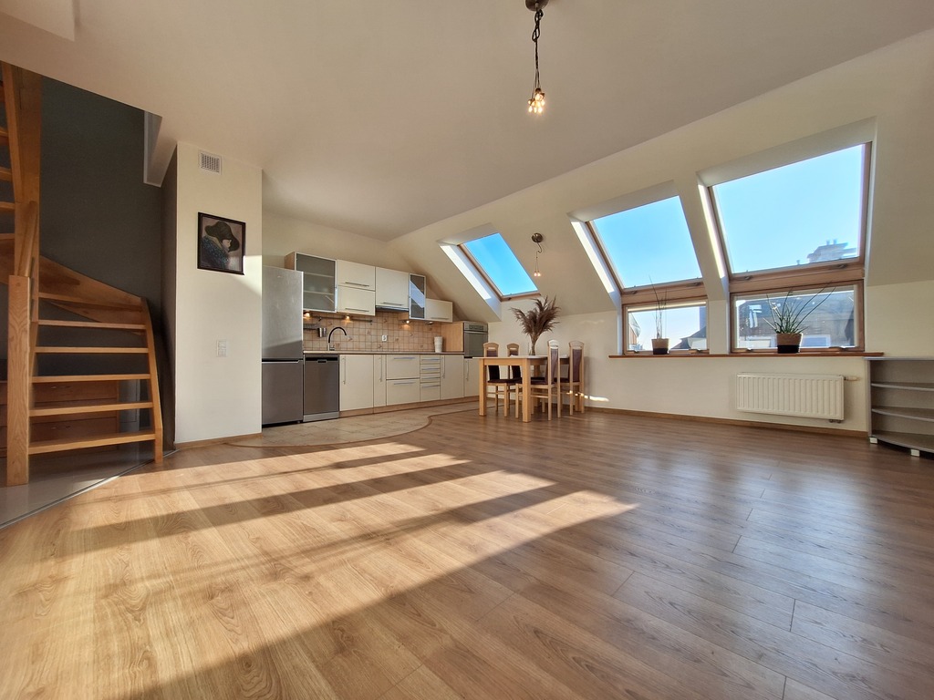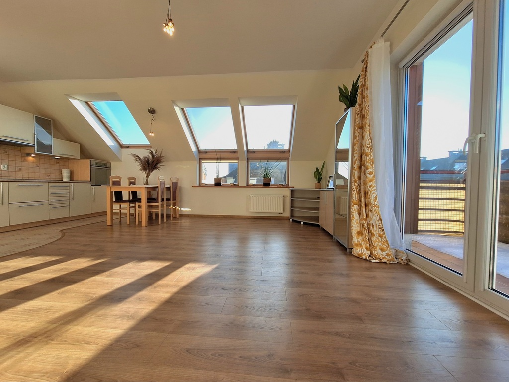 Mieszkanie ma wyjątkowy charakter: duże okna zapewniają piękne doświetlenie, południowo-zachodnia ekspozycja sprawia, że wnętrza są ciepłe i słoneczne, przestronny otwarty salon z aneksem jest podzielony na strefę wypoczynkową oraz jadalną, a kolejne dwa pokoje spełnią funkcję sypialnianą lub biurową - w zależności od potrzeb.